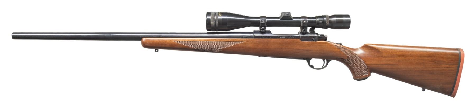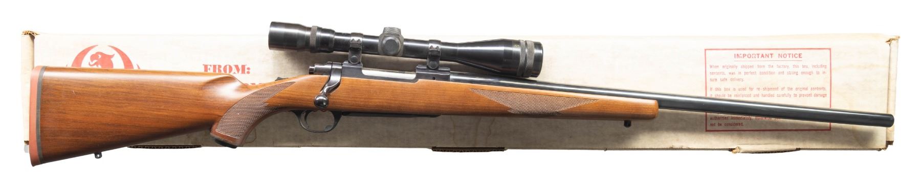 ACTION RIFLE WITH MATCHING FACTORY BOX & WEAVER SCOPE. Cal. 308 Win. S# 72-02839. Mfg. 1976 as Catalog # M77V. Heavy Varminter 24" bbl. w/ Liberty markings. Weaver V12-I, 4x-12x, AO, rangefinding reticle scope on Ruger rings & integral grooves. Magnum action w/ bolt marked w/ matching number & having claw extractor. Checkered walnut pistol grip stock w/ sling studs, Ruger grip cap & red pad. UNATTACHED ACCESSORIES: matching factory box containing. CONDITION: all aspects of rifle near excellent. Scope has Very good plus finish with serviceable optics. (24-2817/MD). MODERN. $600-900.