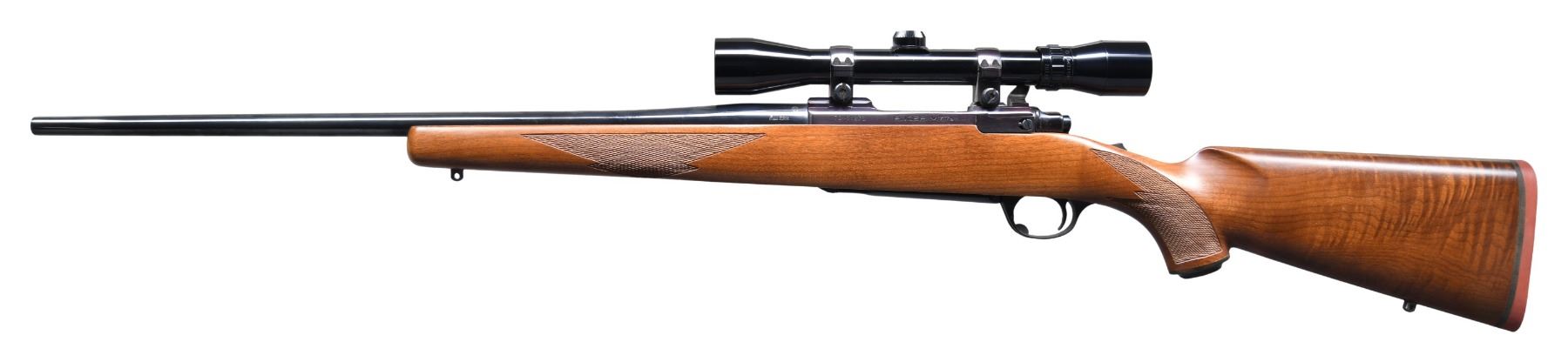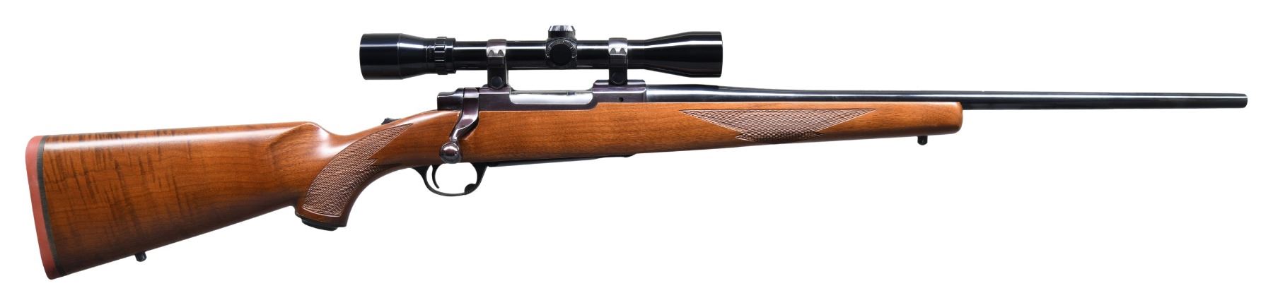 RIFLE WITH BAUSCH & LOMB SCOPE. Cal. 6mm Rem. S# 72-55273. Mfg. 1977 as Catalog # 77R. Bbl. 22" w/out sights. Bausch & Lomb Balfor B, tapered crosshair scope on Ruger rings & integral bases. Matching numbered bolt w/ claw extractor & long action receiver. Checkered walnut stock w/ sling studs, Ruger grip cap & red pad. CONDITION: all aspects near excellent showing light wear on buttpad. Scope has near excellent finish & serviceable optics. (24-2834/MD). MODERN. $600-900.