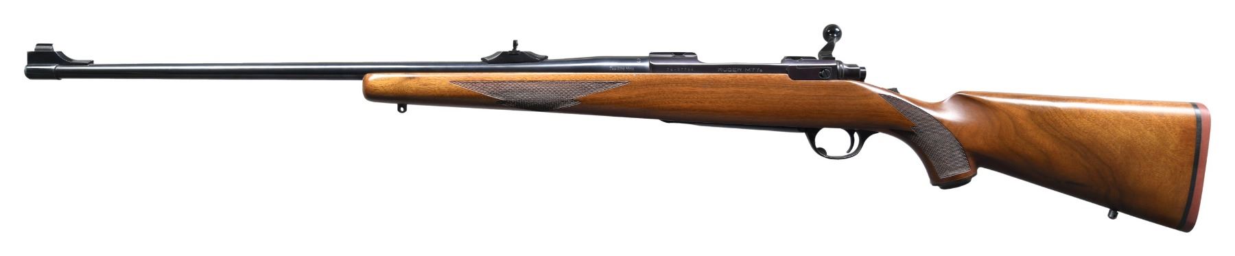 ACTION RIFLE. Cal. 7mm Rem. Mag. S# 74-87794. Mfg. 1980 as Catalog No. 77RS. Bbl. 24" w/ Warning marks. Band mounted gold bead front sight & island mounted adj. folding leaf rear sight. Long Action w/ integral bases; matching numbered bolt w/ claw extractor. Checkered walnut stock w/ sling studs, Ruger grip cap & red pad. CONDITION: all aspects near excellent showing light wear around muzzle. (24-2840/MD). MODERN. $600-900.