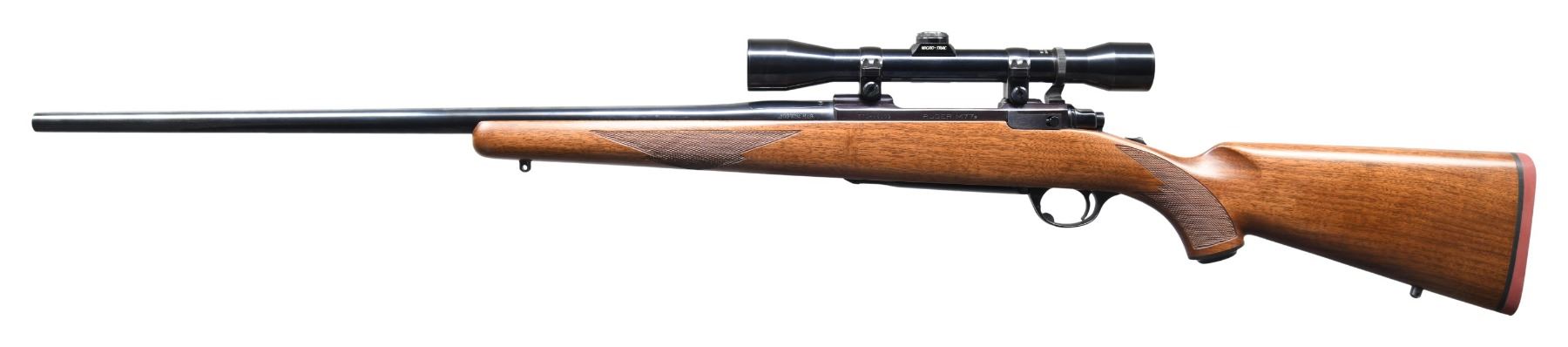 Cal. 300 Win. Mag. S# 770-26159. Bbl. 24" without provision for sights. Mfg. 1985 (1968-1992) as Model 00718 with checkered walnut stock having grip cap, sling studs and red rubber pad. Receiver factory machined for its Ruger 1" scope rings holding steel tubed Weaver K4-1 Micro-Trac scope with duplex reticle. Highly desirable tang safety model with matching numbered bolt assembly. CONDITION: all aspects near excellent including scope set, optics and bore. (24-3155/NW). MODERN. $450-600.