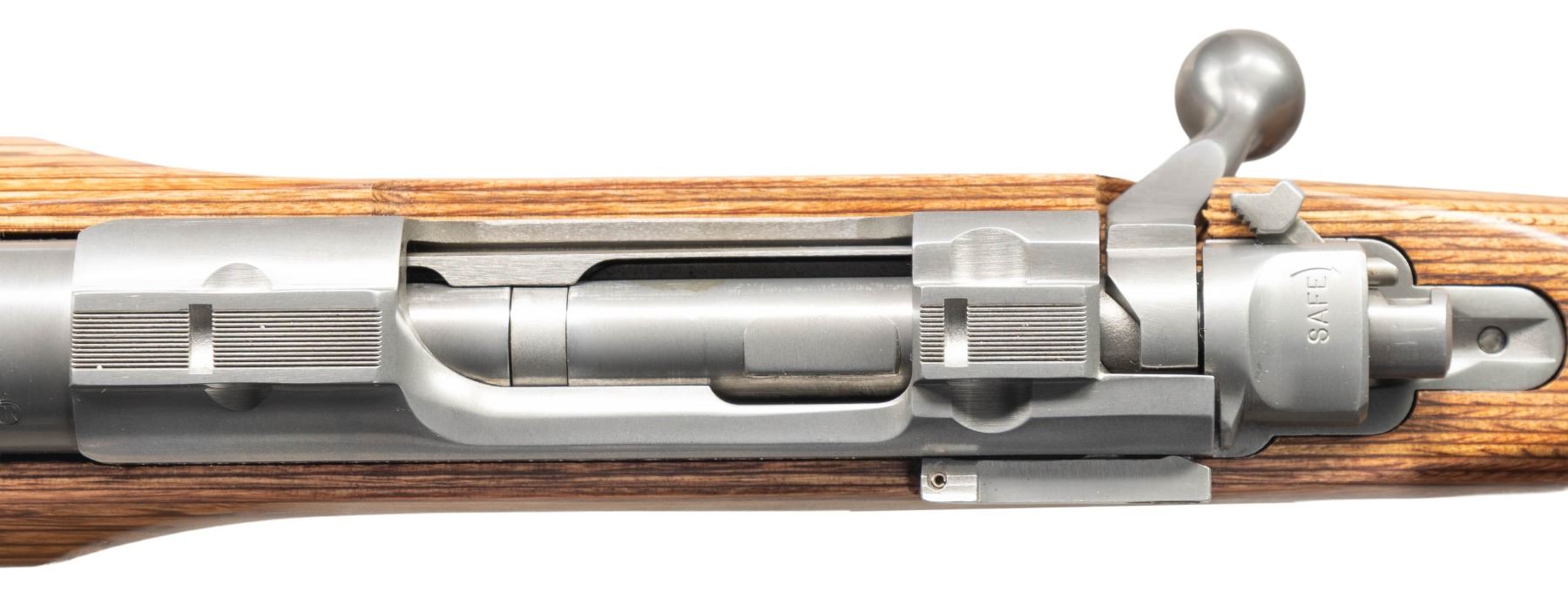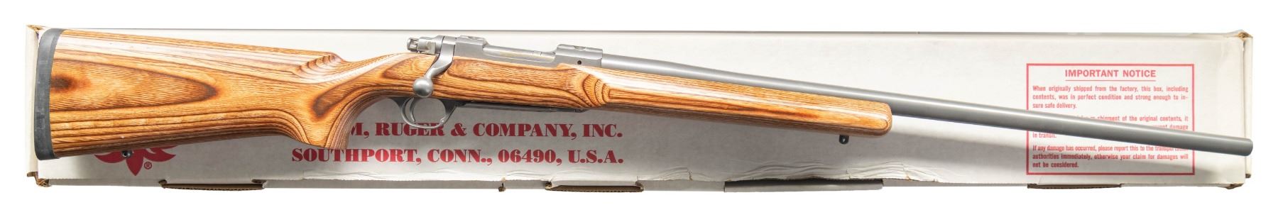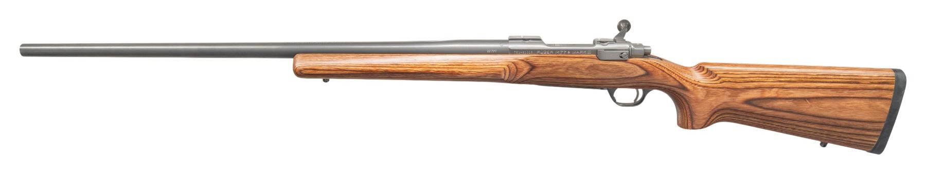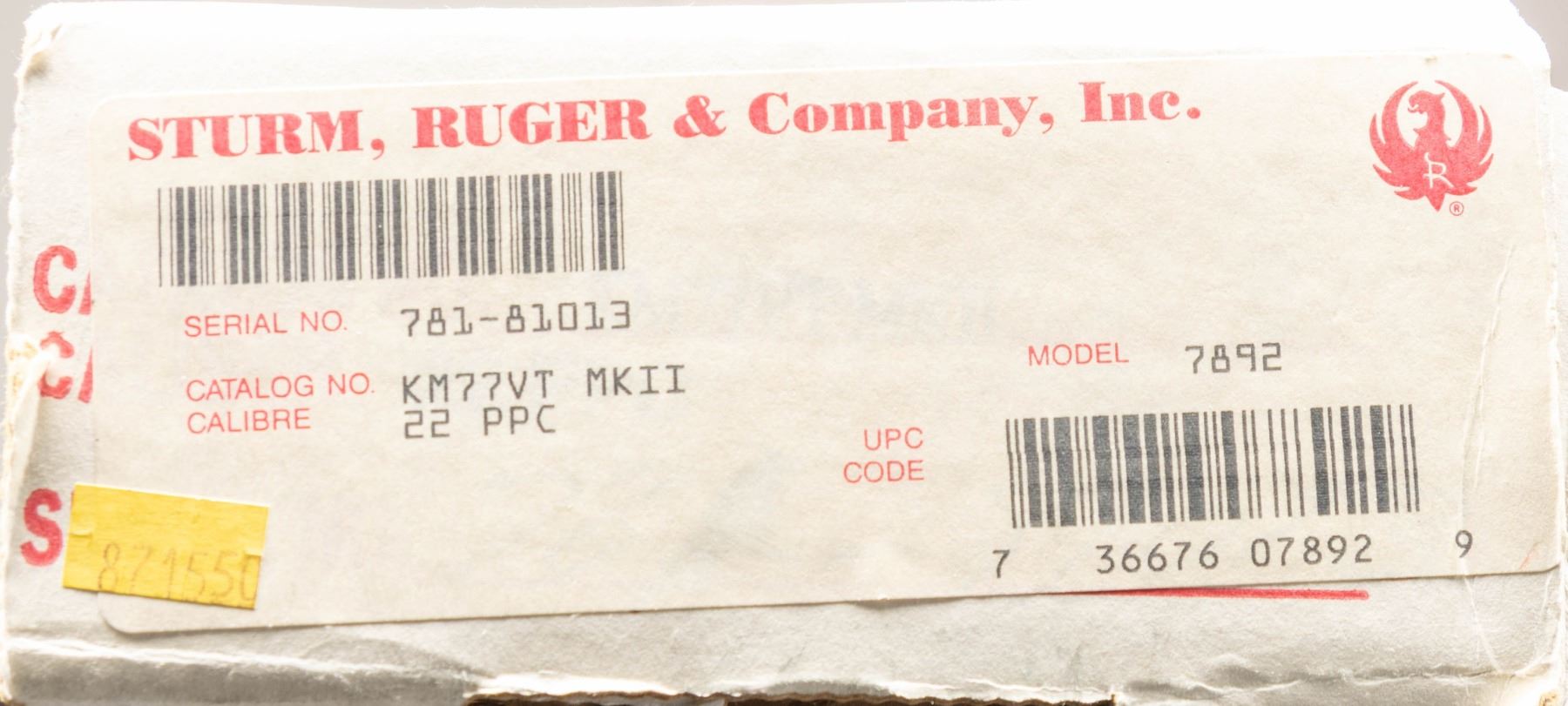 TARGET BOLT ACTION RIFLE WITH MATCHING FACTORY BOX. Cal. 22 PPC. S# 781-81013. Mfg. 1993 as Catalog # KM77VT MKII; Model 7892. Metal has stainless low glare finish. Bbl. 26". Long action has integral ring grooves, claw extractor & matching numbered bolt. Light brown two tone laminate stock w/ black pad. UNATTACHED ACCESSORIES: matching box containing Ruger rings & paperwork. CONDITION: all aspects near excellent. (24-3638/MD). MODERN. $600-800.