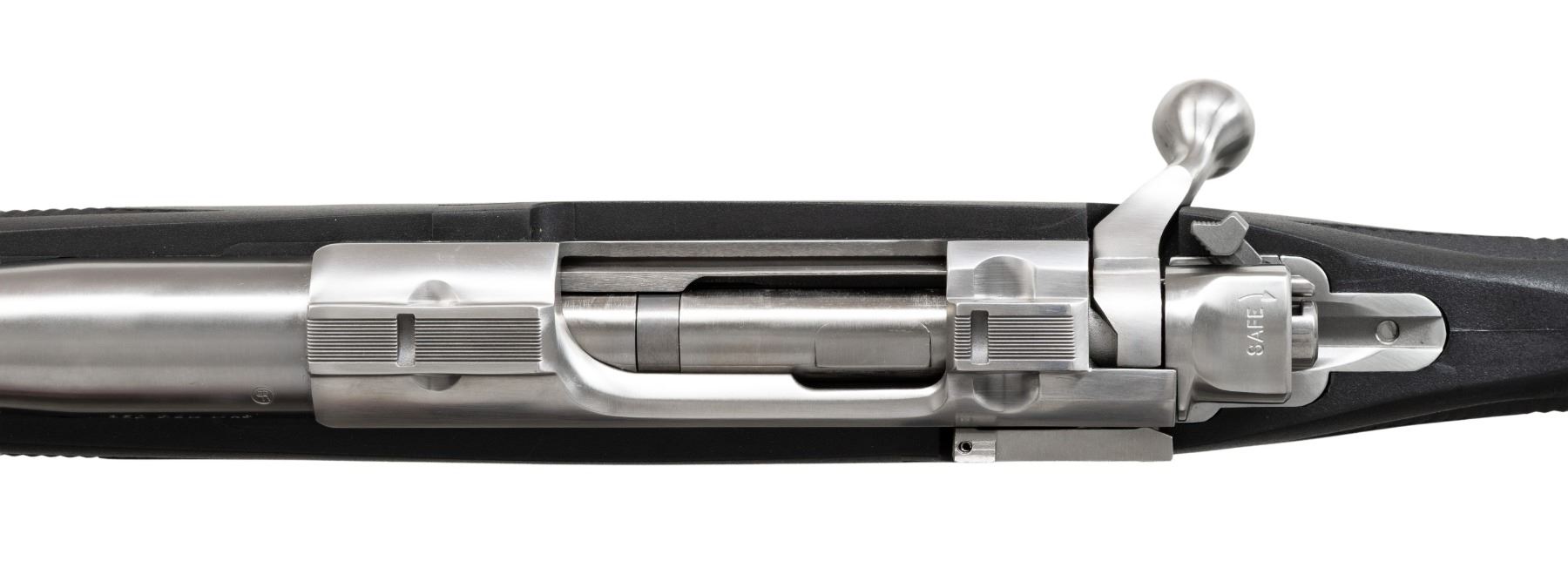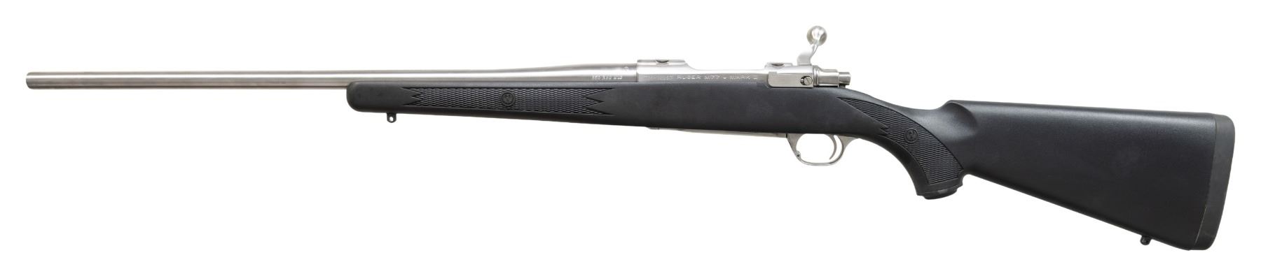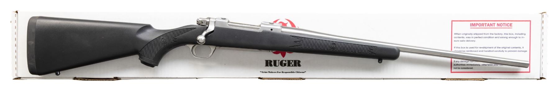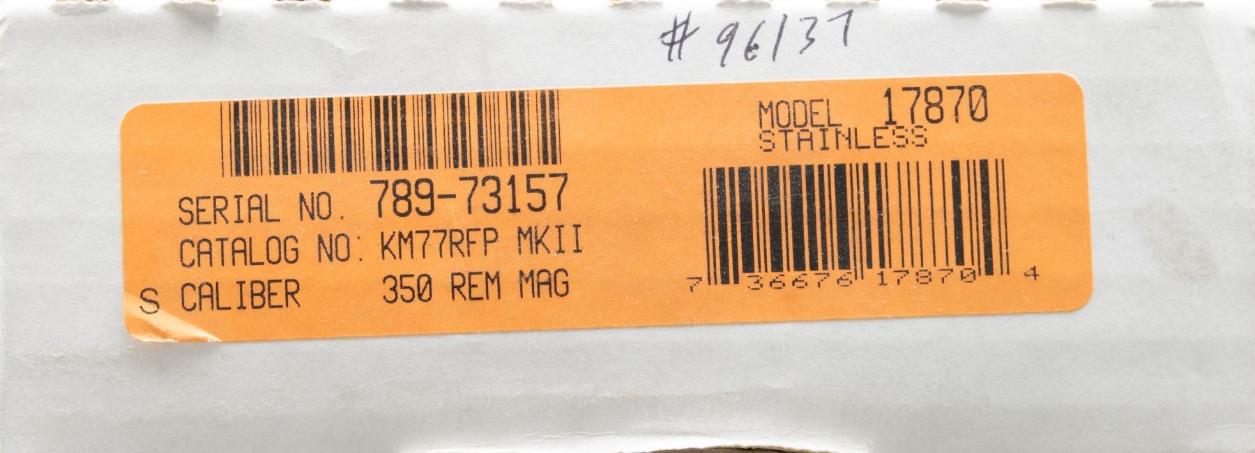 WEATHER STAINLESS BOLT ACTION RIFLE W/ MATCHING FACTORY BOX. Cal. 350 Rem. Mag. S# 789-73157. Mfg. 2005 as Catalog # KM77RFP MKII; Model 17870. Bbl. 22". Stainless steel finish. Short action w/ integral ring grooves, claw extractor & matching numbered bolt. Checkered black Zytel stock w/ sling studs, Ruger grip cap & black pad. UNATTACHED ACCESSORIES: matching factory box w/ Ruger rings, lock & paperwork. CONDITION: as NIB. (24-3261/MD). MODERN. $400-600.