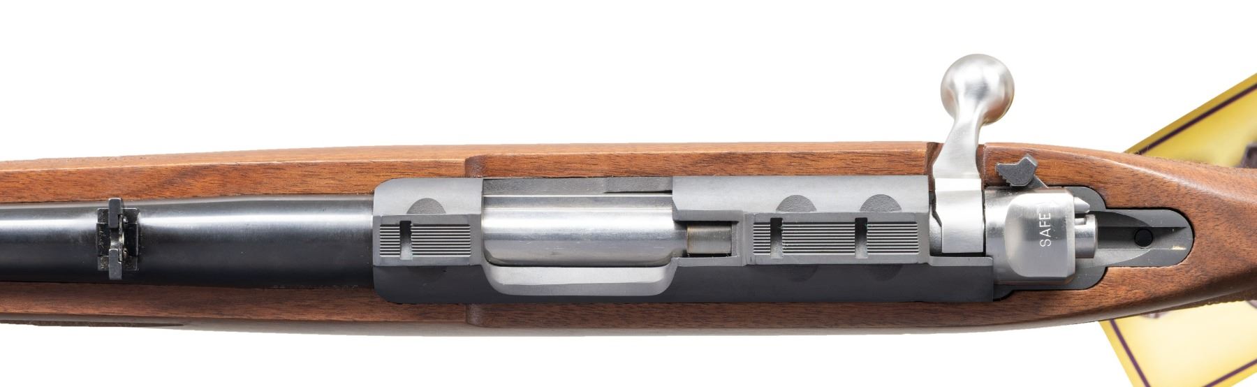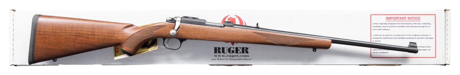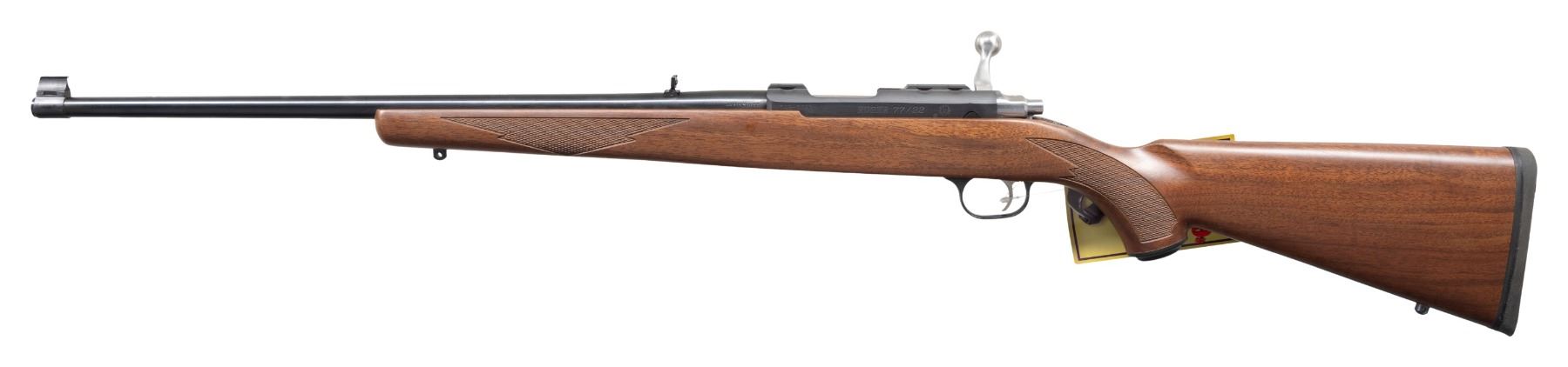 Cal. 22 Mag. S# 703-57505. Bbl. 20" with banded brass bead front sight and folding leaf rear. Mfg. 2009 as Model 07017 being blued with checkered walnut stock having grip cap, black rubber pad and sling studs. MAGS: 1 factory 9 rd. UNATTACHED ACCESSORIES: matching numbered box and packaging to include scope rings. CONDITION: all aspects near excellent appearing new and unfired. (24-3545/NW). MODERN. $400-600.