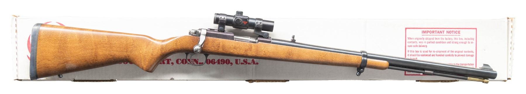 RIFLE. Cal. 50. S# 730-00381. Bbl. 22" round (1 in 28" twist) with dovetailed brass bead front sight; folding leaf rear. Mfg. 1997 (1997-2004; approx. 20,000 units) with blued finish utilizing basic Model 77 Mark II action redesigned for use with muzzle loading caps. Walnut stained birch stock with detachable sling studs and black rubber buttpad. Black fiberglass ramrod. Receiver factory machined for its Ruger 1" scope rings (extension front) holding Millett REDOT SP1 electronic sight. UNATTACHED ACCESSORIES: matching numbered factory box. CONDITION: all aspects near excellent including bore and operable red dot sight set. (01-25516/NW). ANTIQUE. $300-450.