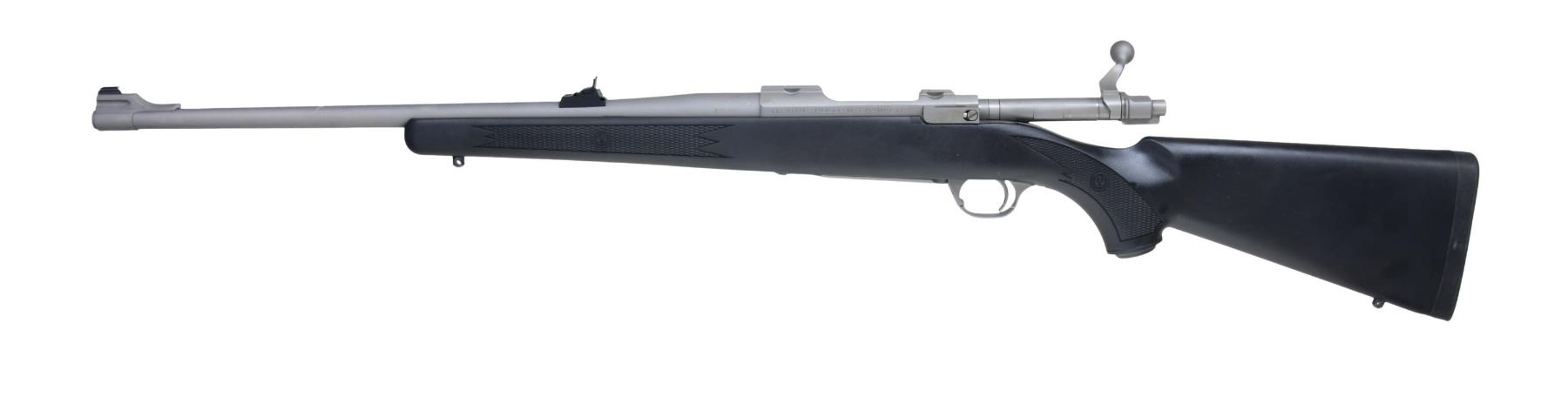 WITH MATCHING FACTORY BOX. Cal. .300 RCM. S# 711-47471. Shipped 2012 as Model 07191 / Catalog No. HKM77PRCM. The rifle features a 20-inch matte stainless steel barrel with a matching matte stainless steel receiver that includes integral scope bases. It is equipped with a flip-up rear sight and a ramp front sight with a brass bead. The rifle has a synthetic stock, featuring a checkered semi-beavertail forearm and a pistol grip buttstock with a smooth black rubber butt-pad. The bolt handle is also matte stainless steel. UNATTACHED ACCESSORIES: Ruger scope rings in factory packaging and a factory box. CONDITION: overall near excellent condition with minimal handling marks on the barrel and receiver. The synthetic stock is in excellent condition with no significant wear. The bore is bright with strong rifling. (24-3414/MD). MODERN. $400-600.