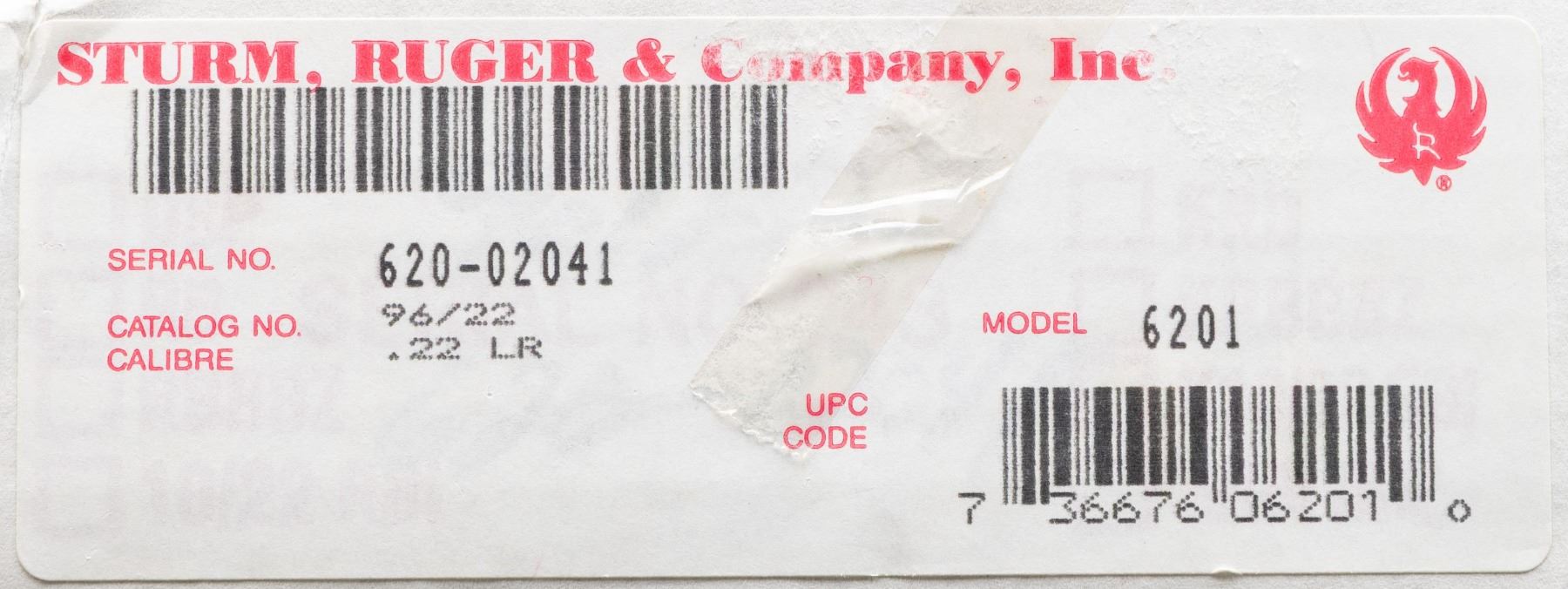 ACTION RIFLE WITH MATCHING FACTORY BOX. Cal. 22 LR. S# 620-02041. Mfg. 1996 as Catalog # 96/22; Model 6201. Bbl. 18.5". Gold bead front sight & folding leaf rear sight. D&T receiver has cocking indicator. Band mounted hardwood stock w/ Celcon buttplate. MAGS: 1 Ruger 10 rd. mag. UNATTACHED ACCESSORIES: matching factory box containing Ruger paperwork & scope rail. CONDITION: all aspects near excellent. (24-3065/MD). MODERN. $400-600.