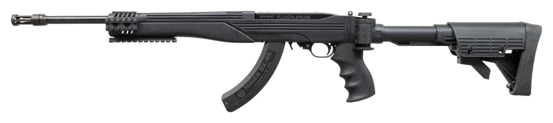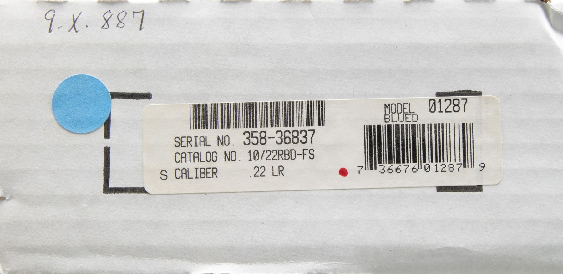 CARBINE WITH MATCHING BOX. Cal. Cal. 22 LR. S# 358-36837. Shipped 2011 as Catalog # 10/22RPD-FS; Model number 01287. Bbl. 16.25" threaded w/ flash suppressor. No iron sights; reveivered D&T for Weaver style rail. Black ATI synthetic folding stock w/ 6 position, adj. comb, black pad buttstock, finger groove pistol grip, & forearm with 3 picatinny rails. MAGS: 1 BX-25 rd. mag. UNATTACHED ACCESSORIES: matching factory box w/ Ruger paperwork, lock, scope rail & forearm accessories. CONDITION: as NIB. (24-2804/MD). MODERN. $450-600.