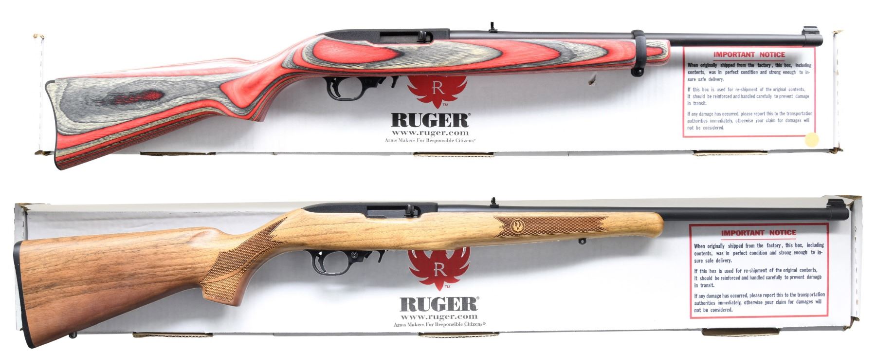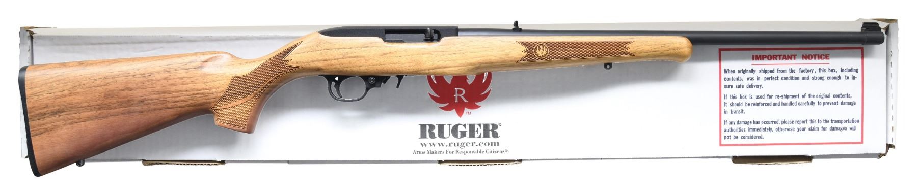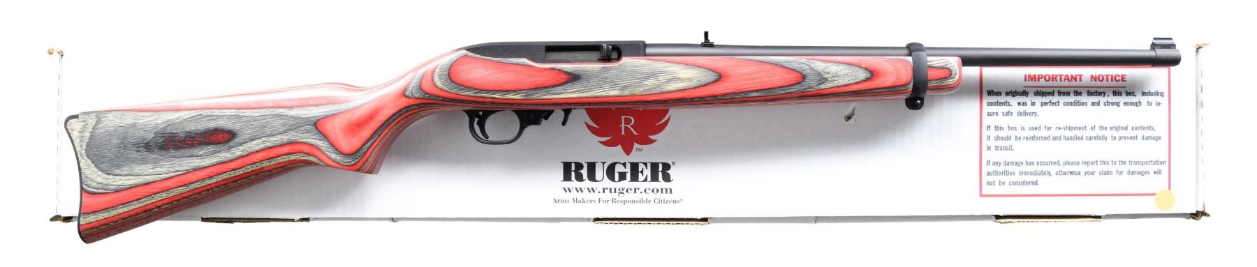 1) 10/22 WITH MATCHING FACTORY BOX. Cal. 22 LR. S# 354-28507. Bbl. 18 5/8". 10/22 semi-automatic rifle mfg. by Ruger in 2009. Top of bbl. is marked with Ruger's mfg. information. Left side of receiver is marked with the S#, followed by "RUGER", as well as the model and cal. designations. Aluminum receiver exhibits a matte textured black finish, with the steel bbl. exhibiting a matte blue finish. 1 piece red laminated wood stock. Black polymer buttplate, trigger assembly, and bbl. band. Brass beaded blade front sight with flip-up U-notch rear sight. MAGS: 1 10-rd. UNATTACHED ACCESSORIES: matching factory box. CONDITION: excellent, with metal components retaining bountiful amounts of their original factory finishes overall. Mirror bore, exhibiting well defined rifling throughout. Wood stock is excellent overall. Box exhibits some mild exterior wear and a small hole in the lid, but otherwise remains sturdy and serviceable. (24-3694/MLW).