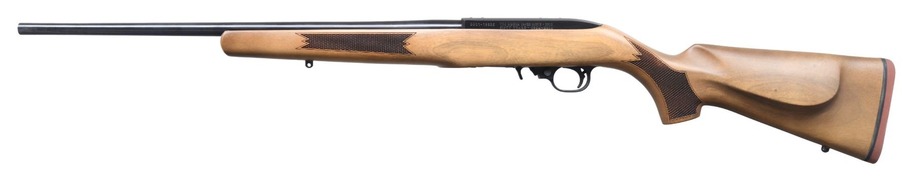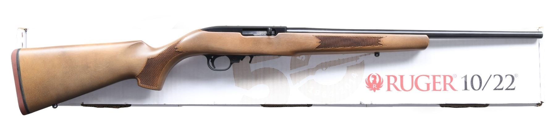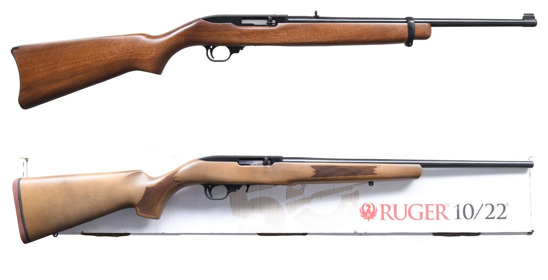 2) NEAR NEW, 50TH ANNIVERSARY RIFLE. S# 0001-18825. Shipped 2014 as Catalog # 10/22-CB; Model 11102. Bbl. 20" w/out sights. Receiver D&T for scope base. Plastic trigger assemblies with extended mag. release. Checkered hardwood cheekpiece stock w/ sling studs & red pad. MAGS: 1 BX-10 rd. mag. UNATTACHED ACCESSORIES: matching factory box w/ Ruger paperwork, lock & rail. CONDITION: as NIB. (24-3422/MD). ALL MODERN. $450-600.