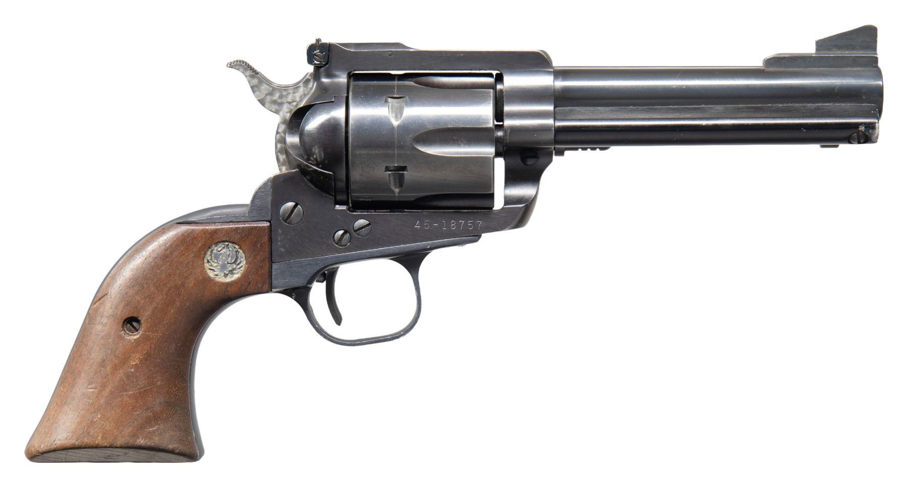 Cal. 45 Long Colt. S# 45-18757. Bbl. 4 5/8" with serrated ramped blade on ramped base front sight and factory frame mounted adjustable rear. Mfg. 1972 (1971-1973; approx. 23,000 units) as blued BKH44 having black anodized alloy ejector housing and XR3-RED grip frame with smooth oiled walnut grips; mismatched medallions (1 black eagle; 1 silver eagle). Collared base pin, recessed cylinder, without factory safety update parts and jeweled sides of hammer. CONDITION: very good overall with minor flaws: slight high point thinning, spots of pinprick oxidation, light handling marks and some small dents on butt. Near excellent bore and chambers. (25-4871/NW). CURIO. $400-600.