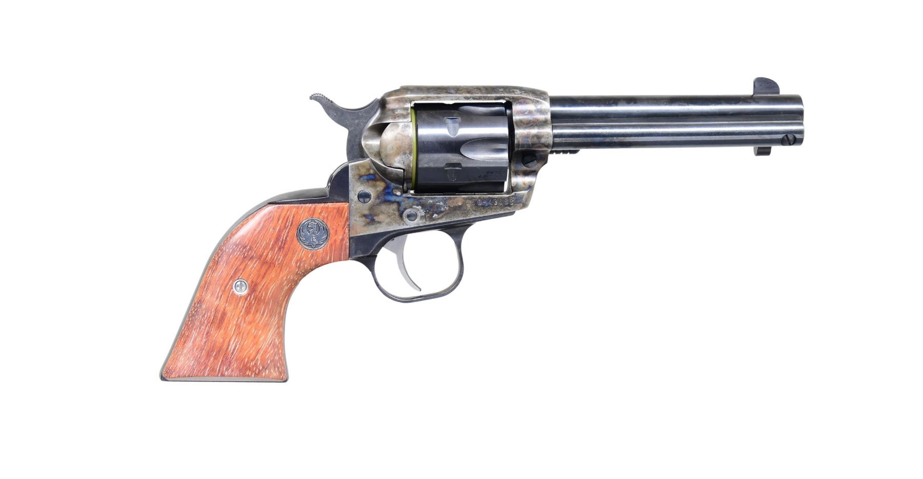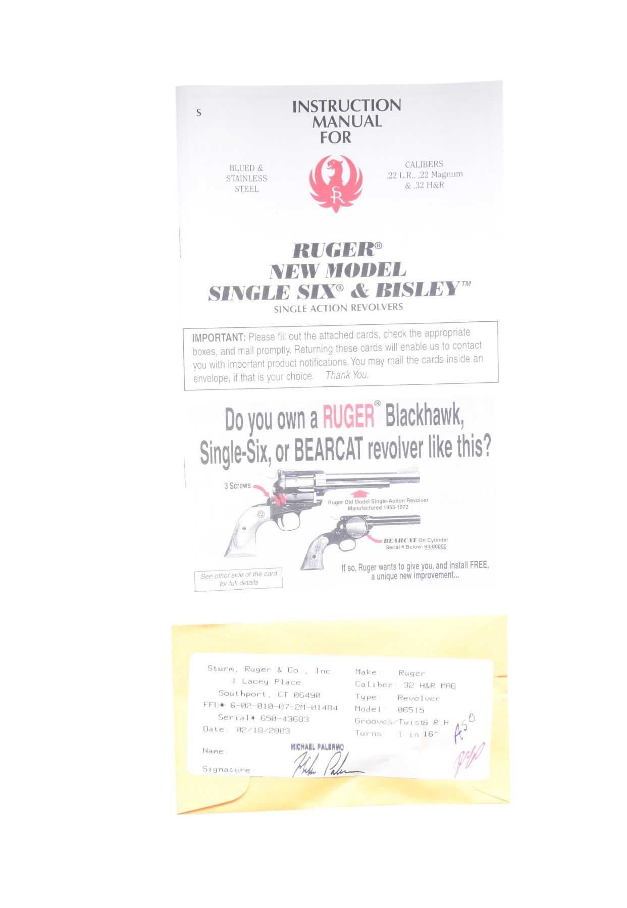 MATCHING BOX. Cal. 32 H&R MAG. S# 650-43683. Mfg. 2003 as Model 06515 / Catalog No. SSM-4F-S. This Ruger New Model Single Six features a blued and case-hardened finish with a 4.75-inch barrel and fixed front sight. The revolver has a SA trigger and an external hammer. The frame is a solid construction with wooden grips. The cylinder holds 6 rounds and is fluted. UNATTACHED ACCESSORIES: factory box and instruction manual. CONDITION: near excellent overall condition with approximately 98% of the original finish remaining. The frame retains about 98% of its finish. The grips are in excellent condition with no significant wear. The bore is bright with sharp rifling. (24-2943/MD). MODERN. $400-600.