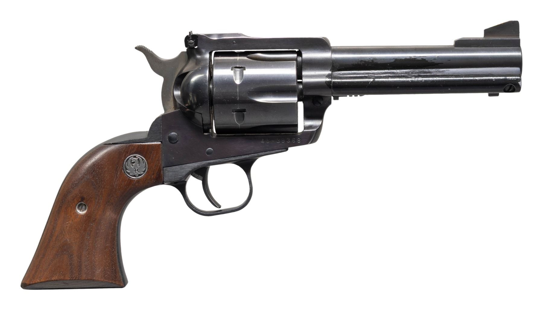 FACTORY RED BOX. Cal. 45 Colt (45 LC). S# 46-39368. Mfg. 1977 as Catalog No. BN-44; no "Liberty" or "Warning" markings. Bbl. 4 5/8". Serrated ramp front sight has orange paint applied; adj. square notch rear sight. Matching numbered 6 shot cyl. Blued & Black finish; black paint on ejector housing. XRN-3RED frame has smooth walnut grips with black eagle medallions. UNATTACHED ACCESSORIES: correct red & white box w/ matching grease pen number on side & Blackhawk BN44 label on end. Box contains Aug 11, 1978 invoice to Norm Greenberg along with wax paper, Ruger warranty card & gun show card. CONDITION: over 90% original blue & black finish with light handling wear, scattered light marks, cyl. turn line & spots of residue. Paint applied to front sight & majority of ejector housing along with overspray on barrel. Very good grips with scattered dents. Very good bore with strong rifling. Box intact good condition with scuffs, sm. tears & sm. holes. PROVENANCE: The Esteemed Norm Greenberg Collection. (25-4155/MD). MODERN. $400-600.