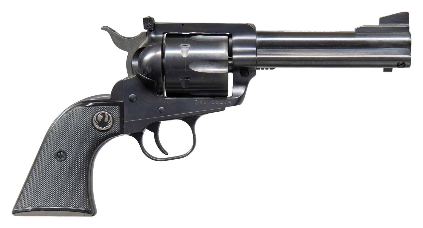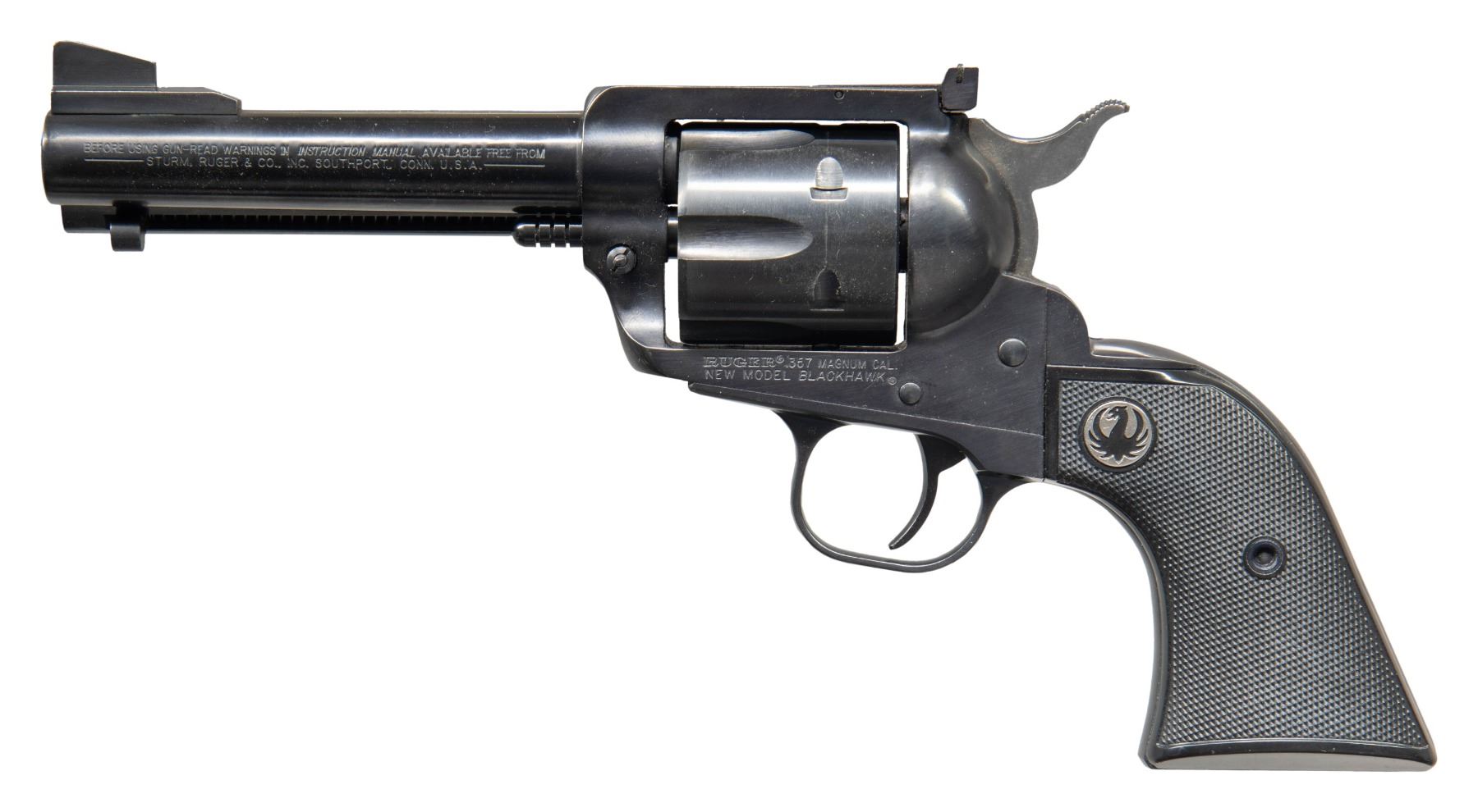Cal. 357 Mag. S# 520-08274. Bbl. 4 5/8" with serrated ramped blade on ramped base; frame mounted "Micro" marked adjustable rear sight. Mfg. 2006 (2005-2006; approx. 17,000 units) with gold filled 50th markings on top of barrel; "warning" marks on left side. Factory reproduction of the original Blackhawk made from 1955-1962 having changes from normal New Model Blackhawk to more closely resemble the originals. Smaller cylinder frame is flat topped with Micro sight, reverse indexing pawl for easier loading / unloading, steel ejector housing, narrower grip straps, grip profile similar to the original XR3 shape (very much like Colt SAA), steel grip frame rather than alloy and checkered plastic grips with black eagle medallions looking like the original hard rubber grips. Unobtrusive action lock under the right grip; no key present (available through Ruger). Fluted 6 rd. cylinder has matching number on face. Originally sold with distinct red plastic anniversary case. CONDITION: very good to near excellent with very minimal handling marks on grips, faint cylinder turn line and very slight evidence of firing; near excellent bore. PROVENANCE: Estate of Groves Herrick. (25-5694/NW). MODERN. $350-500.