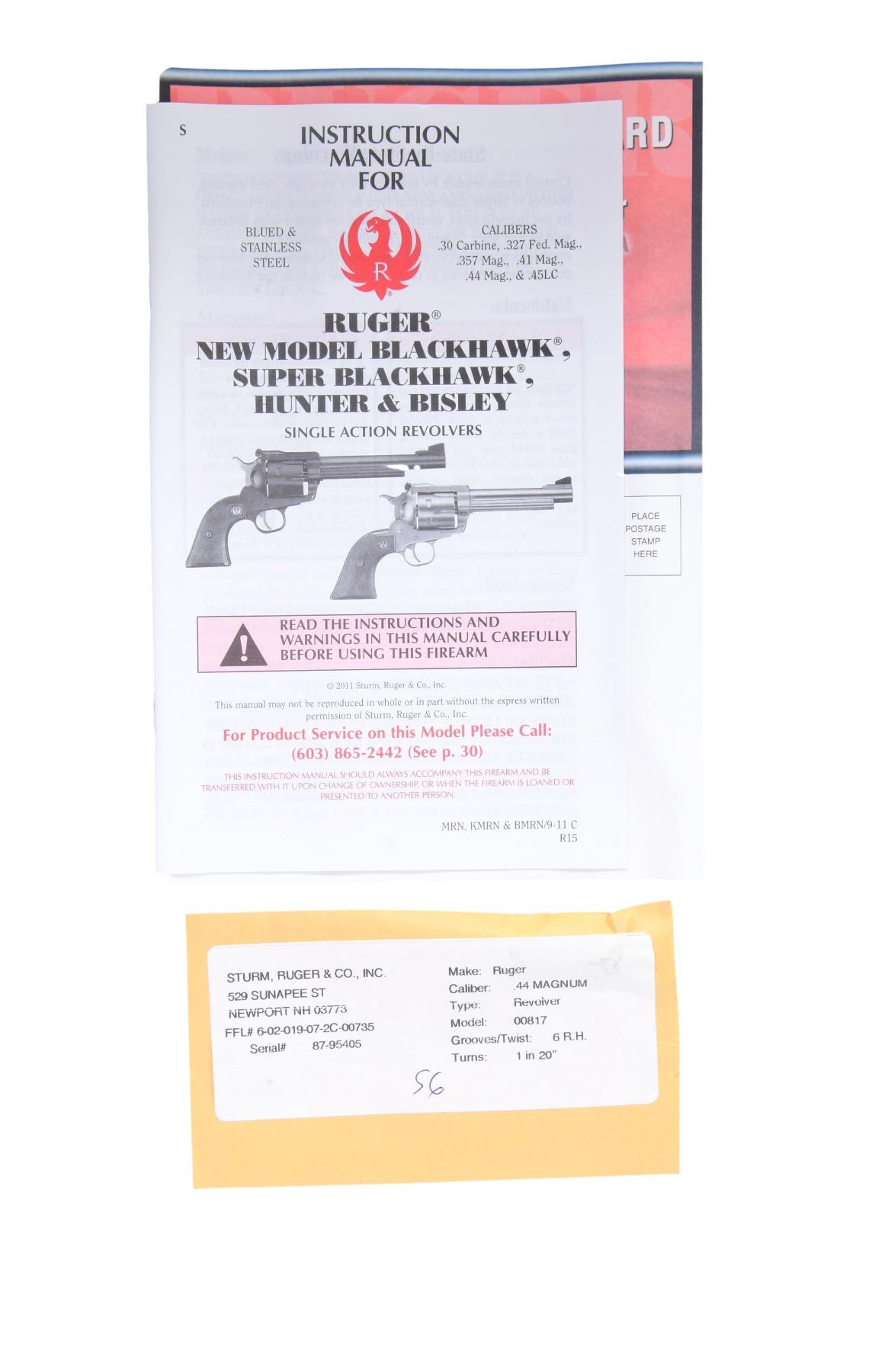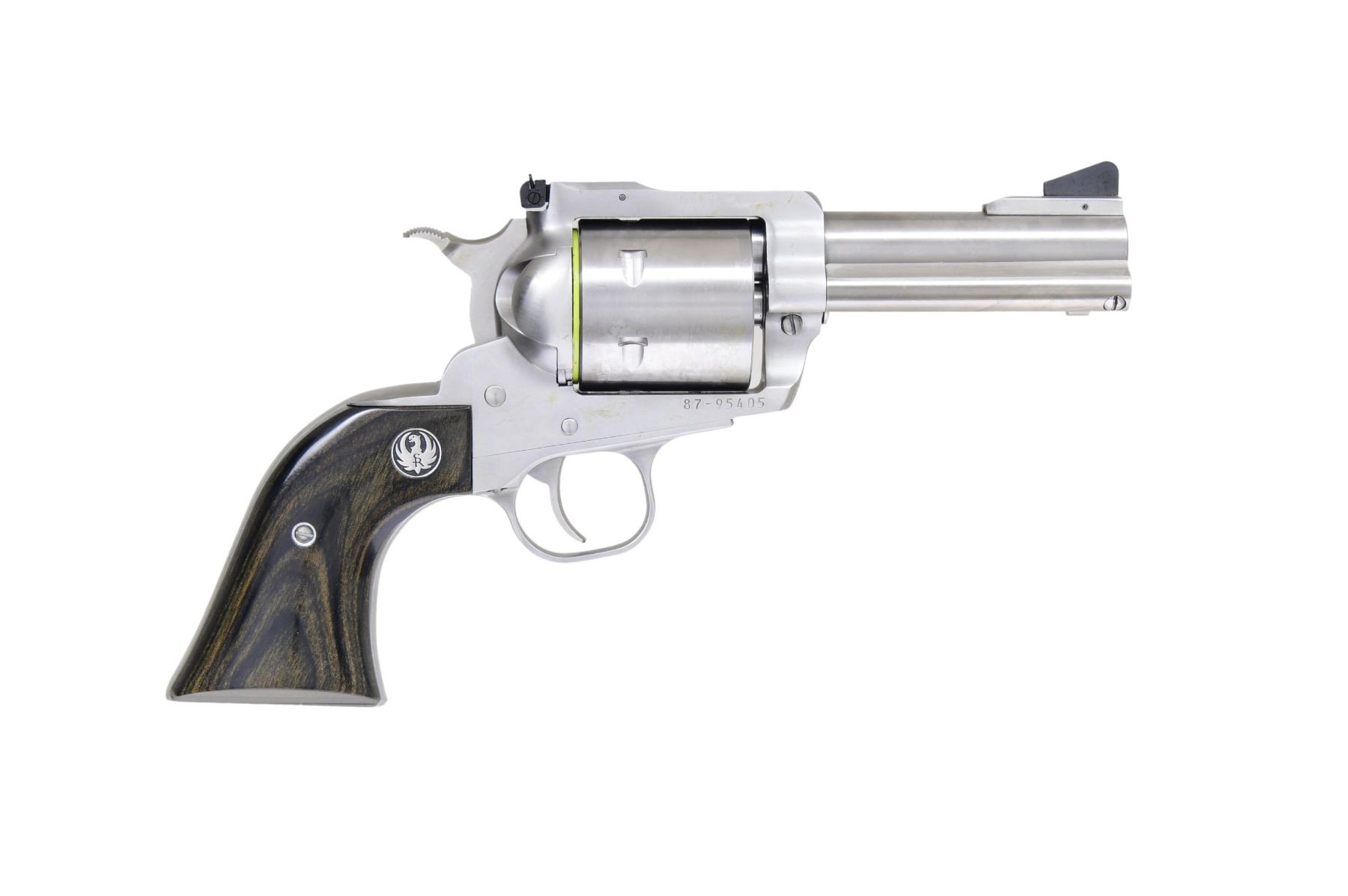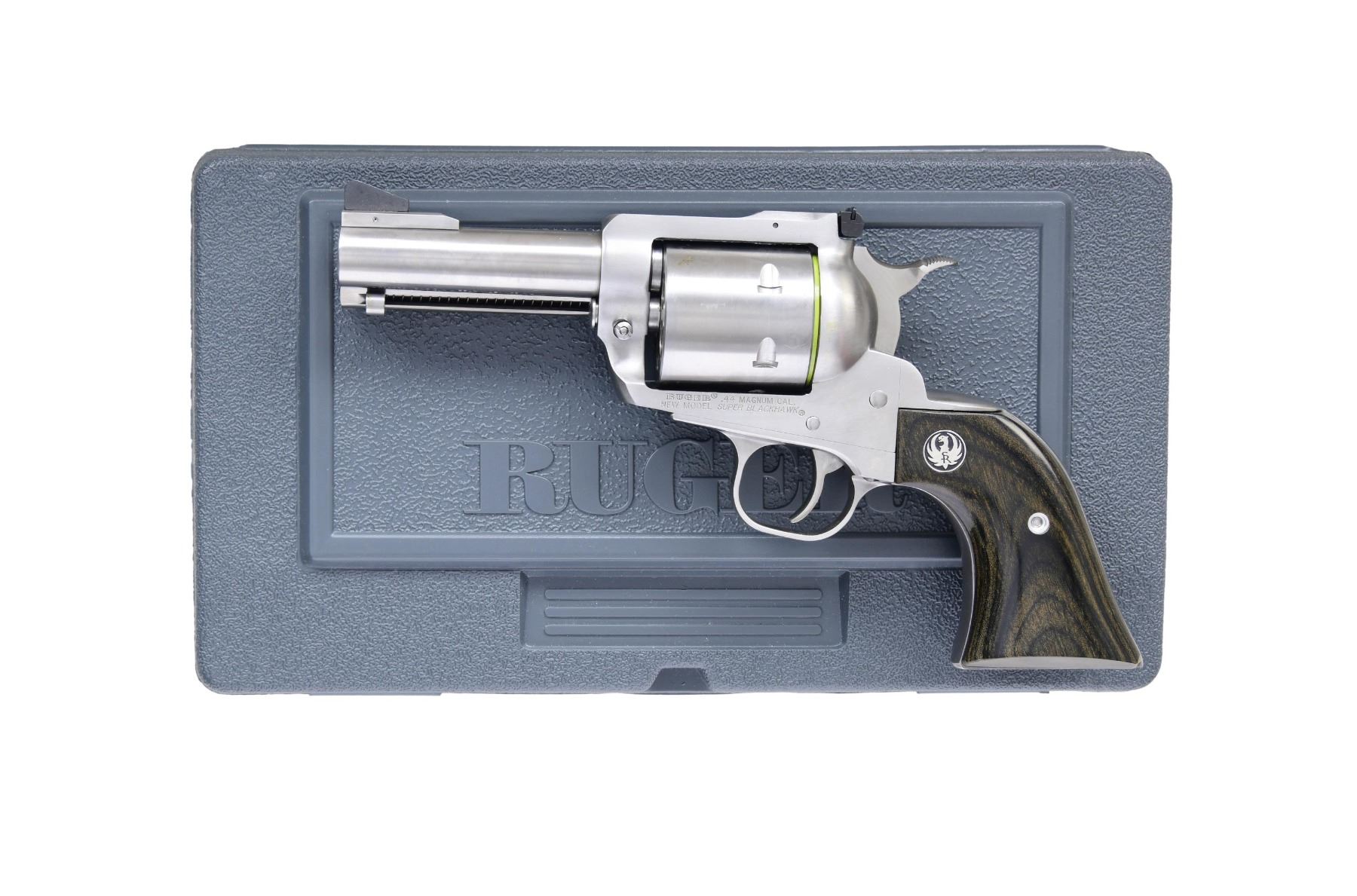 BLACKHAWK SA REVOLVER WITH MATCHING FACTORY BOX. Cal. 44 Mag. S# 87-95405. Mfg. 2012 as Model 00817 / Catalog No. KS-43N. This revolver features a stainless steel finish. Manufactured with a 4.62-inch barrel. The front sight is ramped, and the rear sight is adjustable. The trigger is stainless, and the hammer is also stainless. The frame is of standard configuration. The cylinder holds six rounds and is fluted. The grips are smooth laminate wood with the Ruger emblem. UNATTACHED ACCESSORIES: factory box and instruction manual. CONDITION: overall condition is near excellent with approximately 99% of the original finish remaining on the barrel and frame. The grips are in near excellent condition with minimal wear. The bore is bright with strong rifling. (24-3020/MD). MODERN. $500-750.