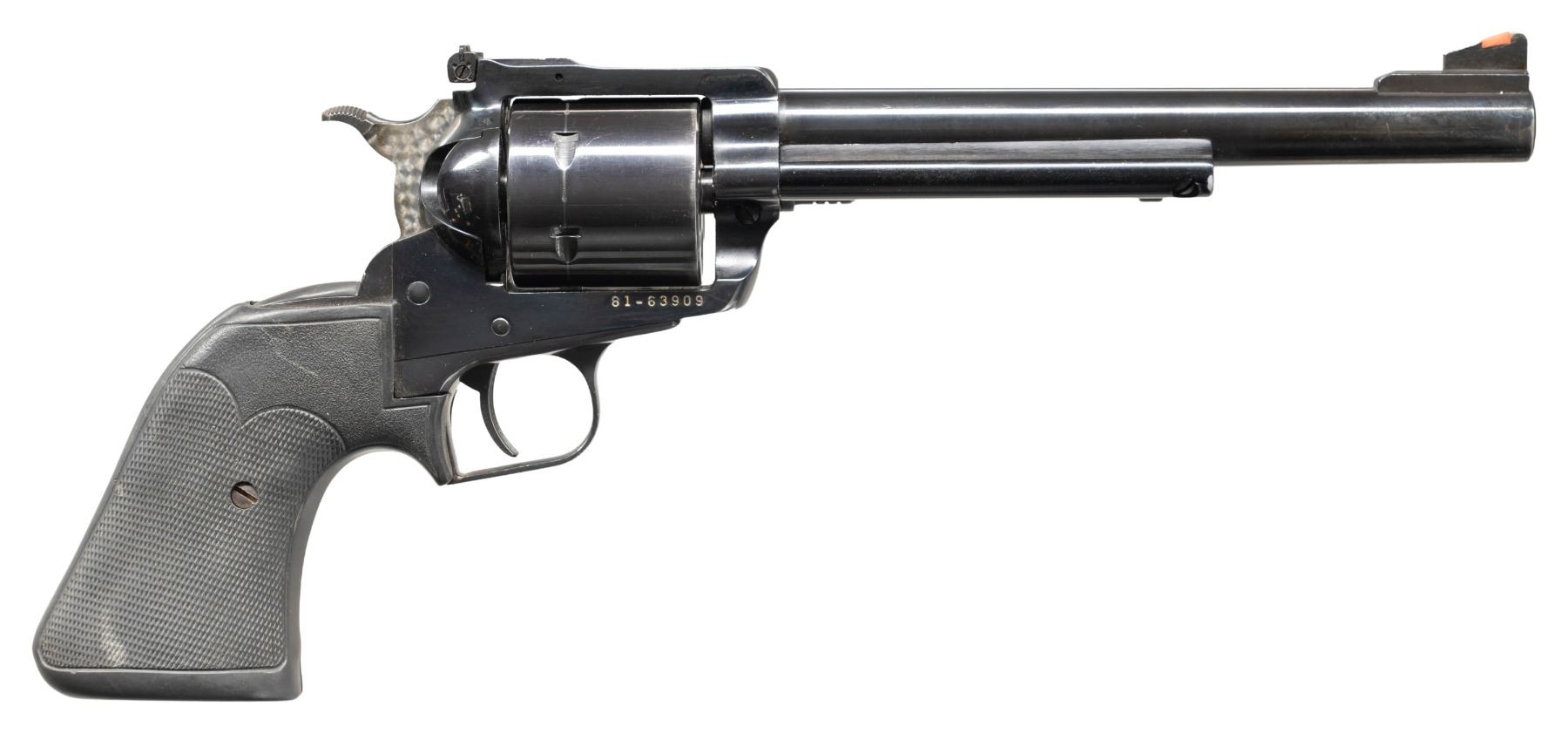 Cal. 44 mag. S# 81-63909. Bbl. 7 1/2" with ramped base having serrated ramped blade sight with added red insert; factory adjustable frame mounted rear sight having white outlined blade. Mfg. 1976 (1973 to date) per references, yet barrel does not have Bicentennial marking or "warning marks" (initiated 1978) but has Southport address and eagle logo. Traces of Bonanza Gold in markings. Standard wide spur hammer (jeweling added) and serrated trigger. Alloy ejector housing and Pachmayr Signature rubber grips. CONDITION: Generally very good with high edge wear on ejector housing, cylinder (along with turn line), top strap, muzzle, top of front sight and lower front of cylinder frame. Very good grips and near excellent bore. (25-4854/NW). MODERN. $300-450.