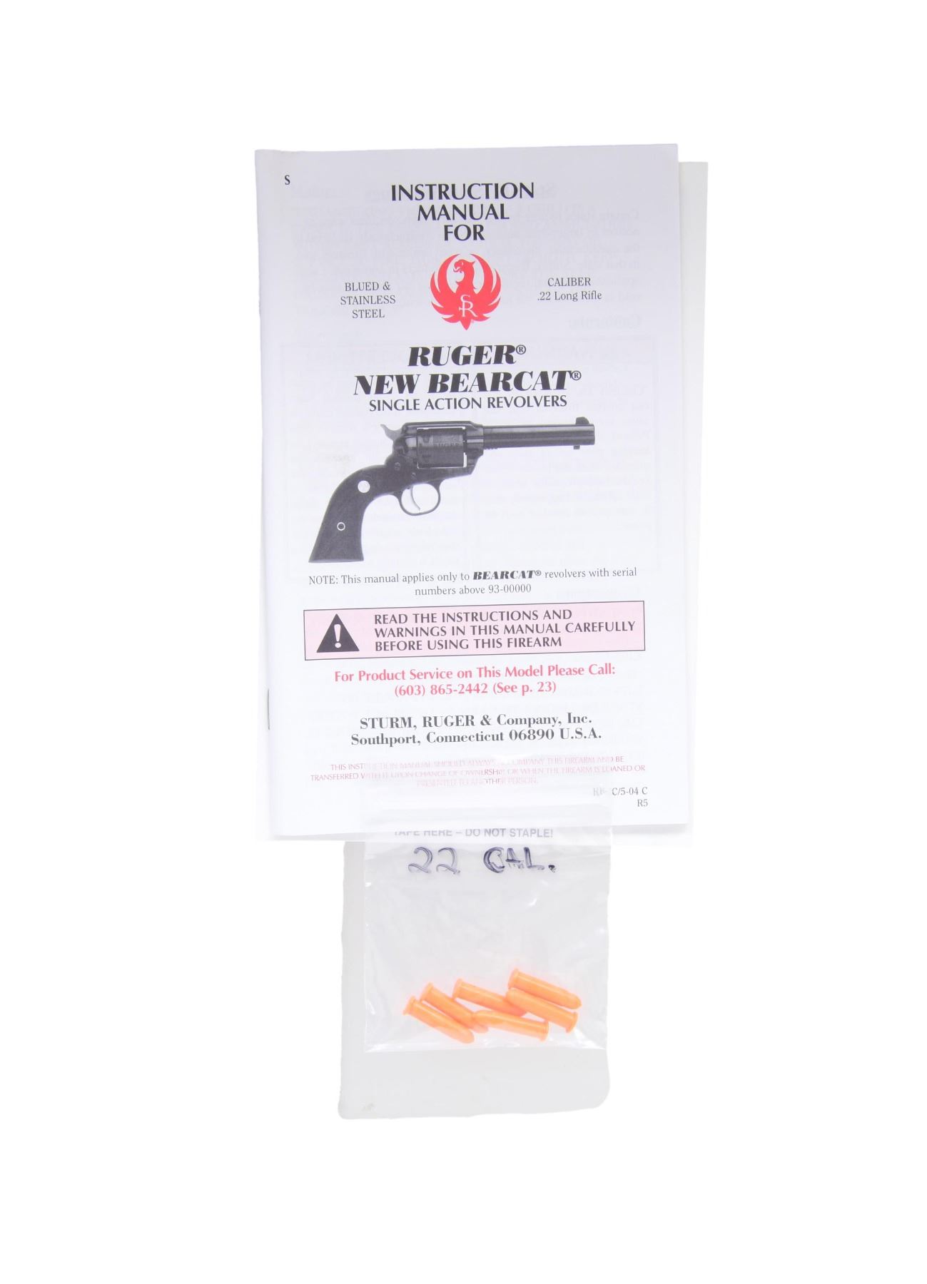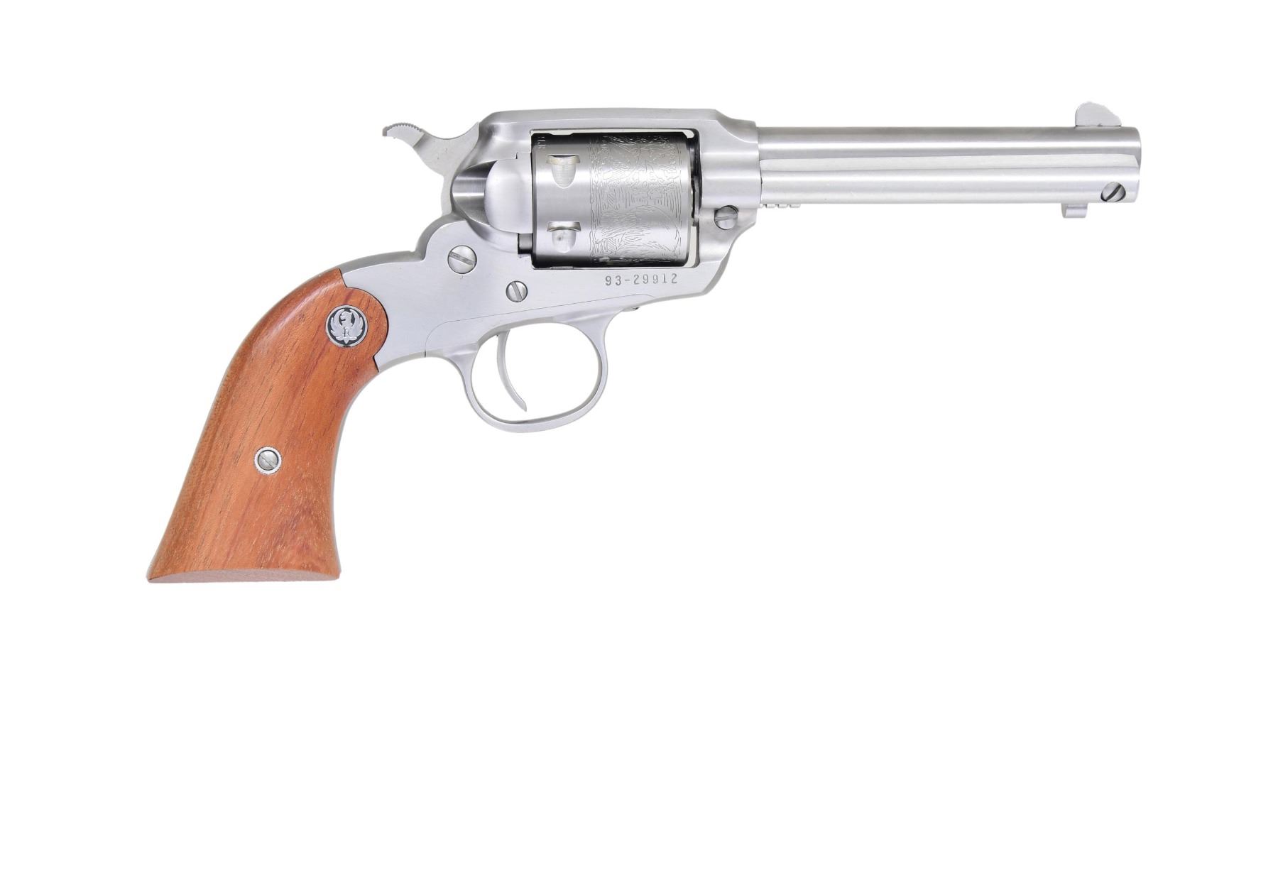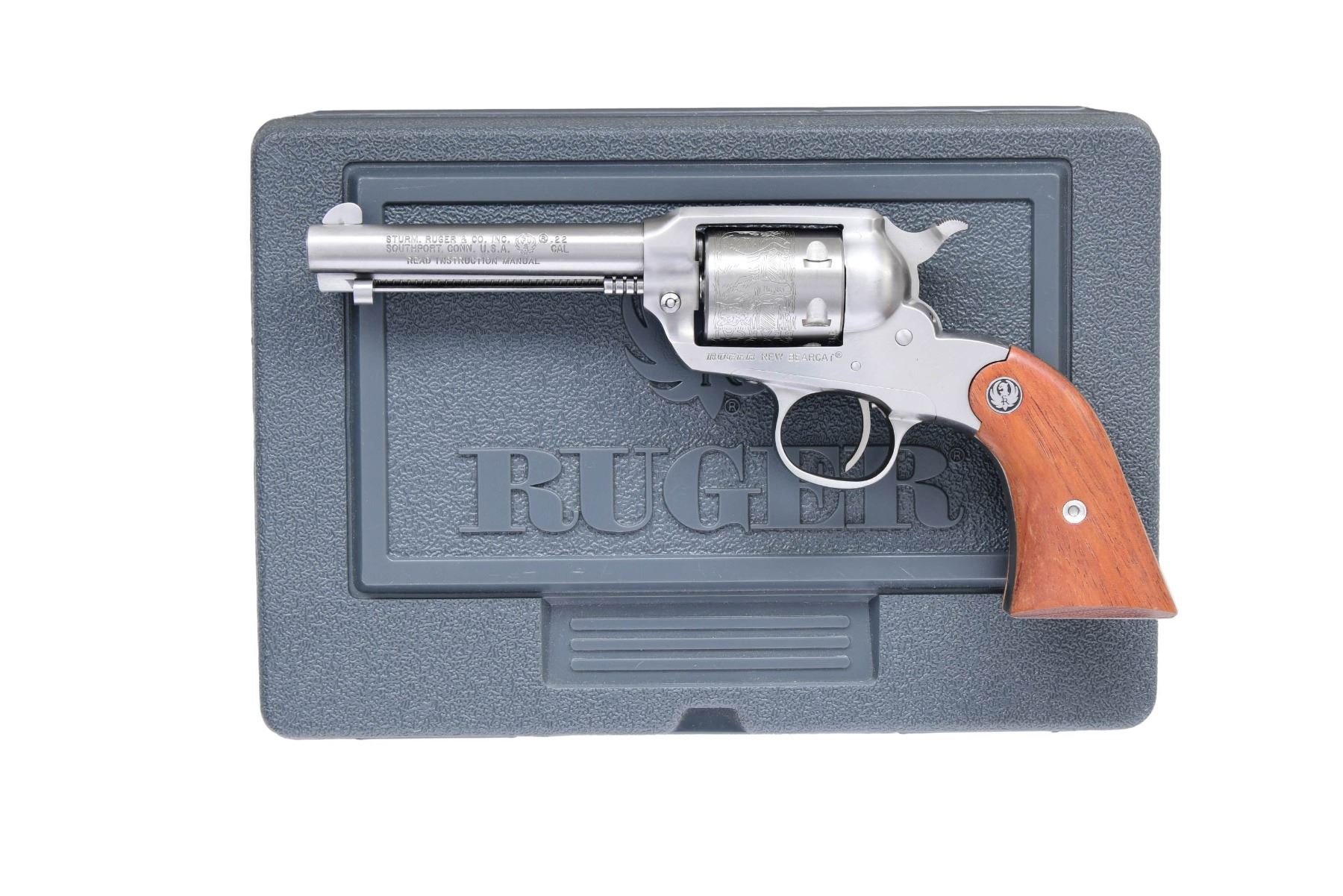 1) RUGER NEW BEARCAT WITH MATCHING BOX. Cal. 22 LR. S# 93-29912. Mfg. 2004 as Model 00913 / Catalog No. KSDC-4. Satin stainless steel. Bbl. 4.2". 6 Shot cyl. Smooth walnut grips with the Ruger emblem. UNATTACHED ACCESSORIES: factory box w/ packaging. CONDITION: near excellent overall including rifling. (24-2980/MD).