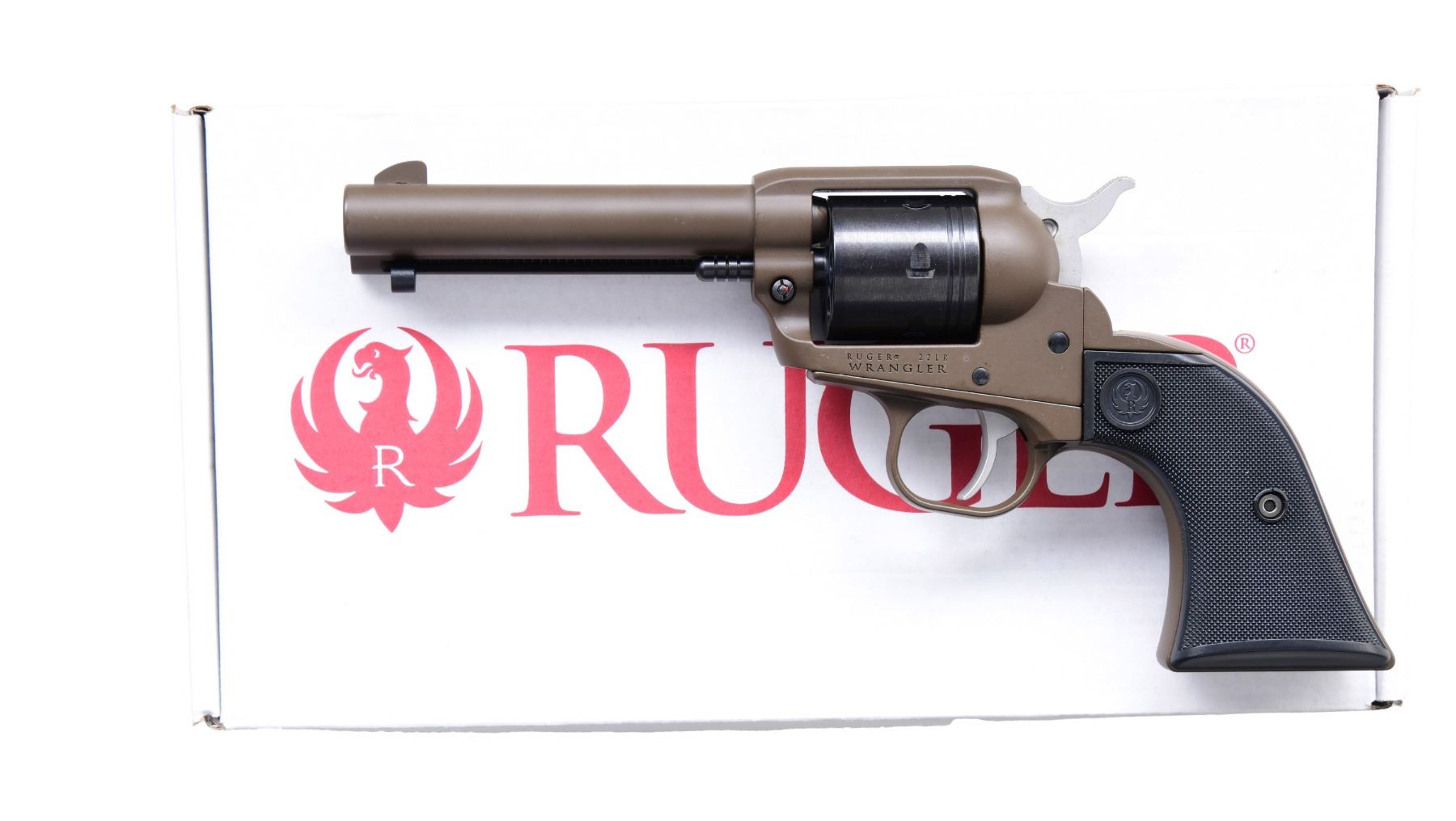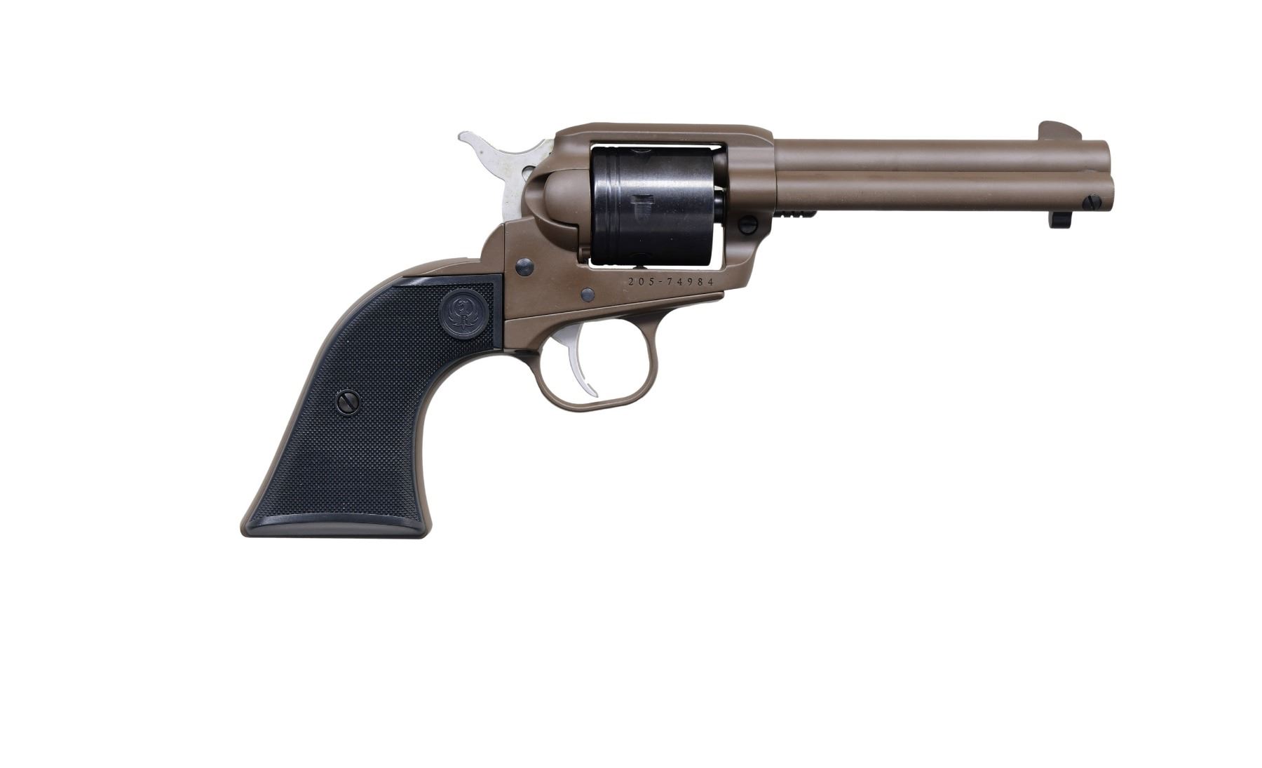 2) DISTRIBUTOR EXCLUSIVE RUGER WRANGLER WITH FACTORY BOX. Cal. .22 LR S# 205-74984. Mfg. 2021 as Model 02021. Bbl. 4.62". Standard fixed sights. Plum Brown Cerakote finish. 6 Shot cyl. Black checkered polymer grips with Ruger medallions. UNATTACHED ACCESSORIES: factory box. CONDITION: overall near excellent including rifling. (24-2996/MD) ALL MODERN. $500-800.