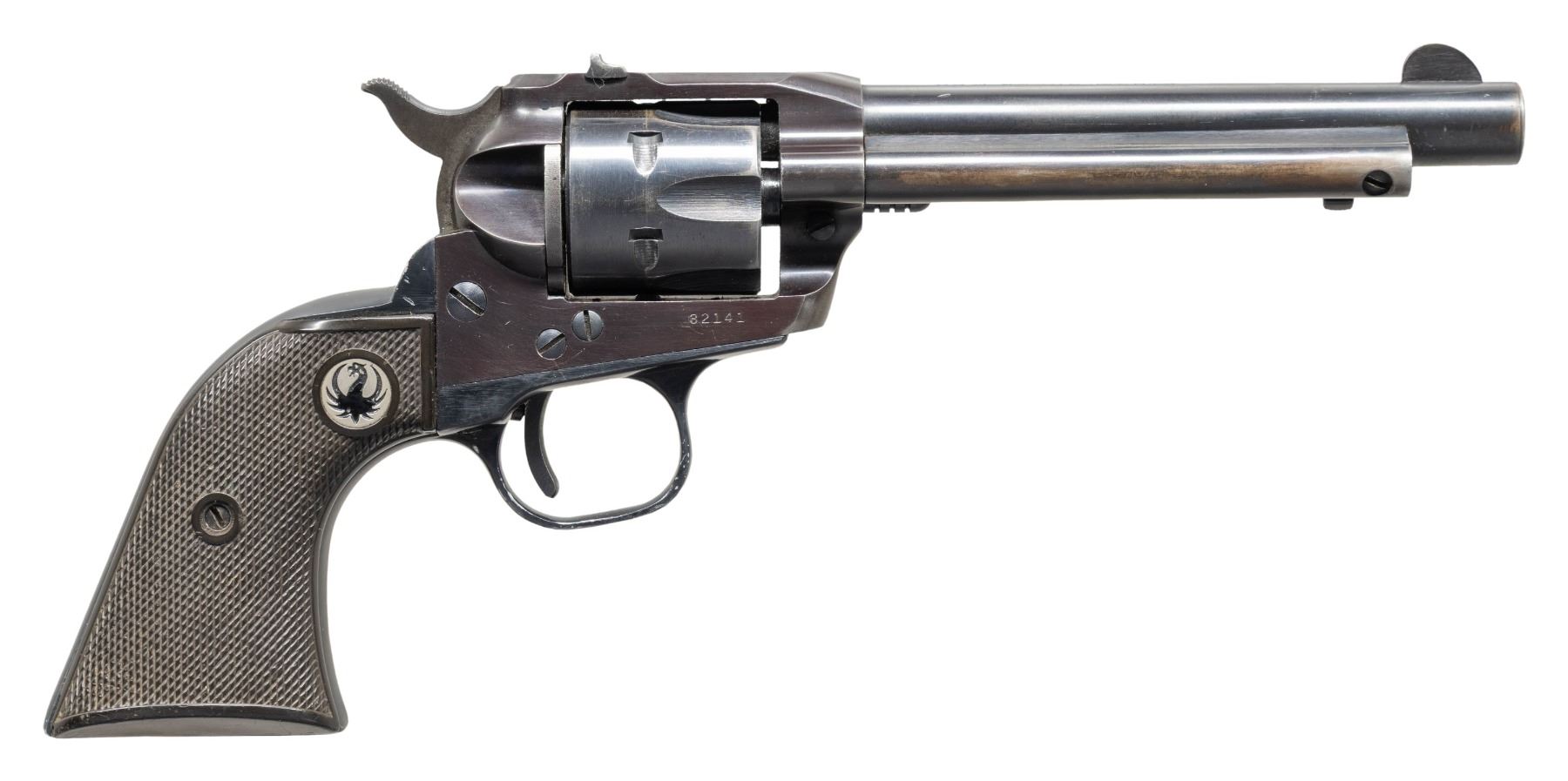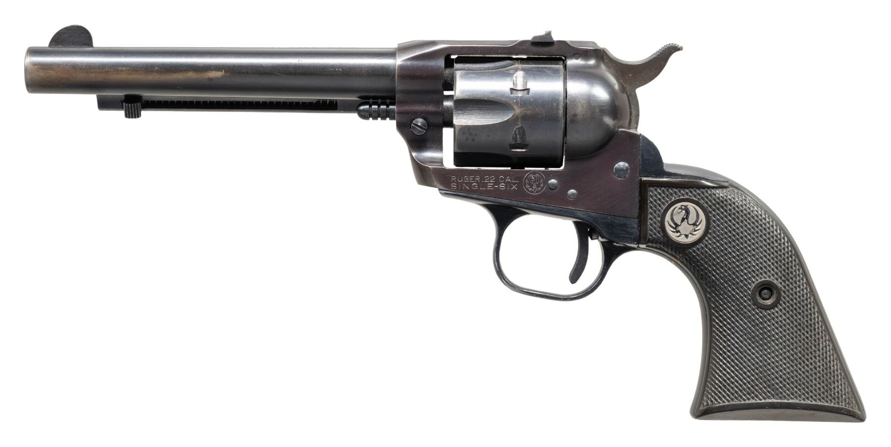 Cal. 22 LR. S# 32141. Bbl. 5 1/2" with serrated faced blade front sight; drift adjustable frame mounted rear. Mfg. 1956 (1953-1973 for all Old Model Single-Sixes) with early collector Type 3 features of: XR3 grip frame having checkered hard rubber grips with black eagle medallions, stepped recoil shield, "fat" trigger without factory safety update conversion, long throw offset ejector housing, serrated ejector button, capped base pin latch and sought after flat loading gate. CONDITION: good to very good original finish with high point wear throughout, cylinder turn line going into stop leads plus holster like wear on left side of barrel, ejector housing and around front edge of cylinder. Grips have light hand wear. Near excellent bore. PROVENANCE: The Esteemed Norm Greenberg Collection. (25-4133/NW). CURIO. $300-450.