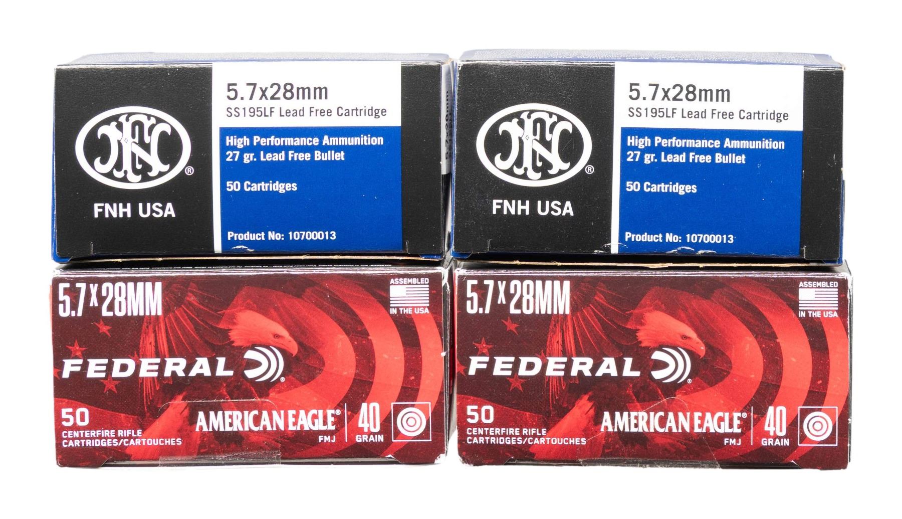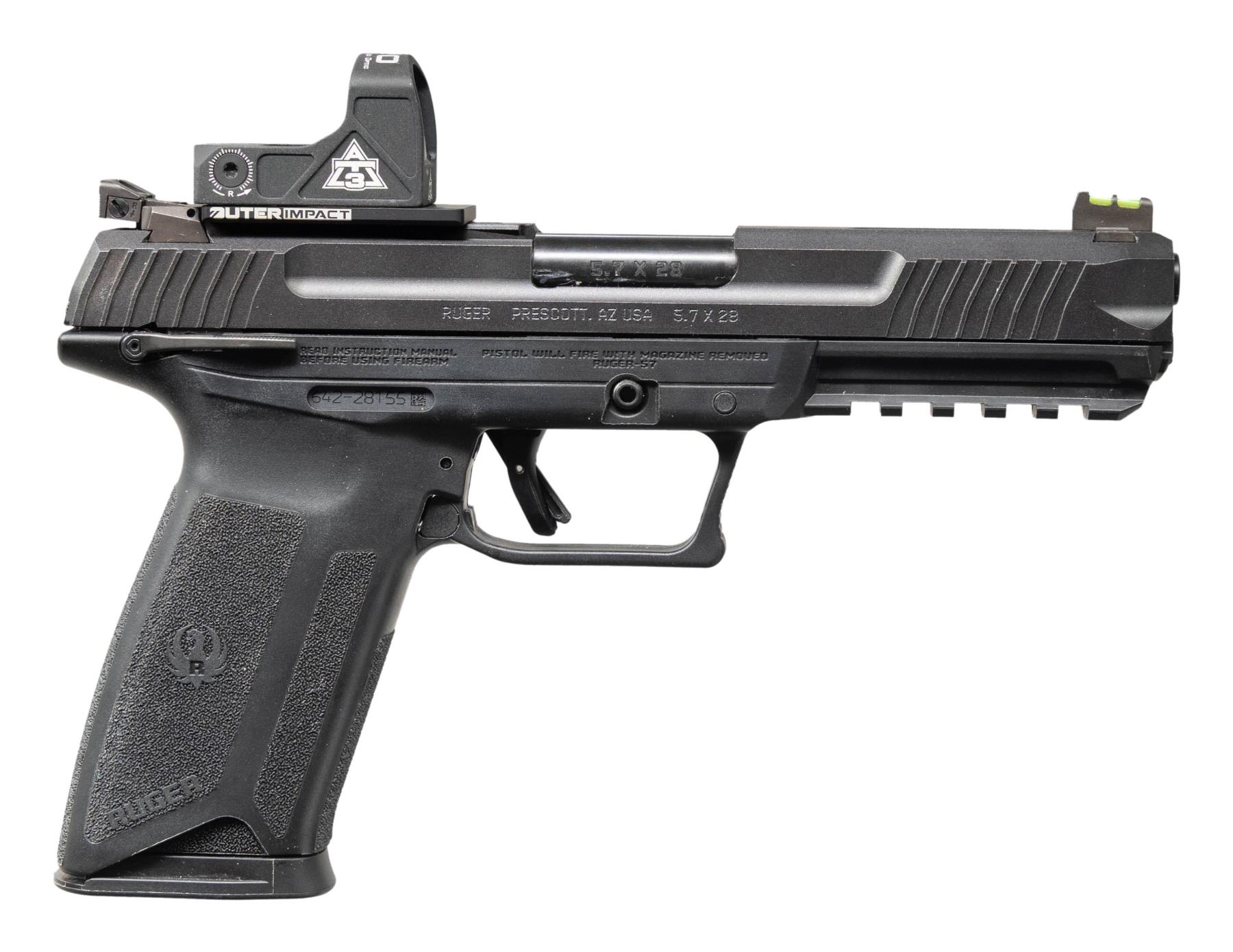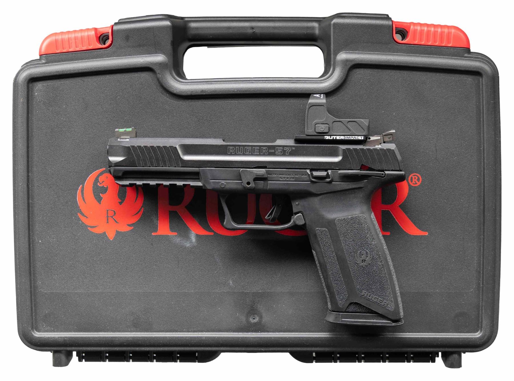 Cal. 5.7X28MM. S# 642-28155. Bbl. 4.94" black Nitride coated alloy steel. Mfg. 2021 (2020 to date) as Model 16401 that is not subject to factory recall as serial number is above affected pistols. Black oxide finished slide has Outer Impact reflex sight base with ARO AT3 red dot sight installed in addition to its standard dovetailed green fiber optic front sight and factory adjustable rear sight. Frame is ergonomically designed and made of high performance glass filled nylon with provision for reversing magazine latch. Extended 1911 style ambidextrous safety, loaded chamber port, and 5 slot Picatinny style accessory rail. Secure Action fire control having hidden hammer and blade safety trigger. High cut squared trigger guard. MAGS: 2 steel drop free factory 20 rd. UNATTACHED ACCESSORIES: matching numbered factory black plastic carry case with packaging plus 4 boxes (50 rds. each; 200 rds. total) of ammo (2 FN & 2 Federal). CONDITION: all aspects near excellent with like new appearance. (25-6112/NW). MODERN. $450-600.