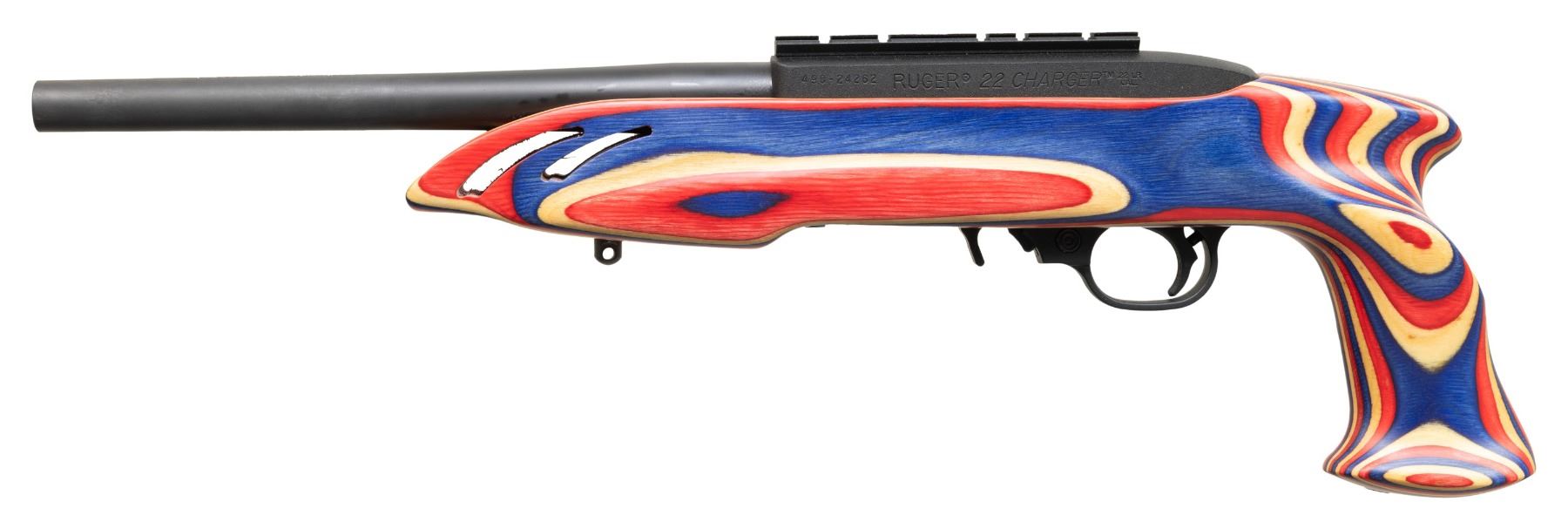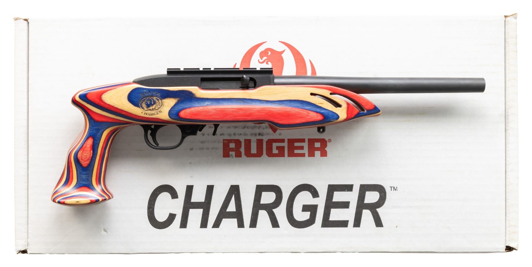 WITH MATCHING FACTORY BOX. Cal. 22 LR. S# 490-24262. Bbl. 10". 22 Charger semi-automatic pistol mfg. by Ruger in 2008. Top of bbl. is marked with Ruger's mfg. information, with the S#, "RUGER 22 CHARGER" and the cal. designation marked on the left side of the receiver. Aluminum receiver exhibits a matte black finish, with the steel bbl. exhibiting a matte blue finish. Red, white, and blue laminated wood stock, with black polymer trigger guard. MAGS: 1 10-rd. UNATTACHED ACCESSORIES: matching factory box, containing factory soft case. CONDITION: near new, with metal components retaining virtually all of their original factory finish overall. Mirror bore, exhibiting well defined rifling throughout. Wood stock is excellent overall. Box shows some light to mild exterior wear, but otherwise remains sturdy and serviceable. (24-3577/MLW). MODERN. $300-500.