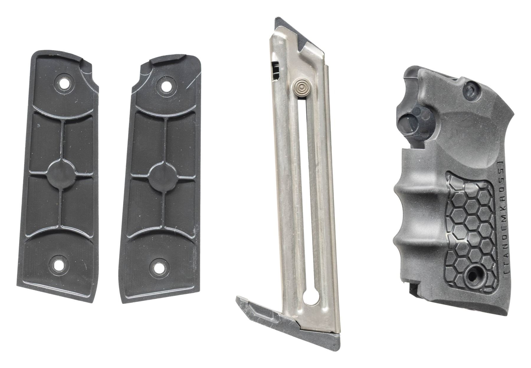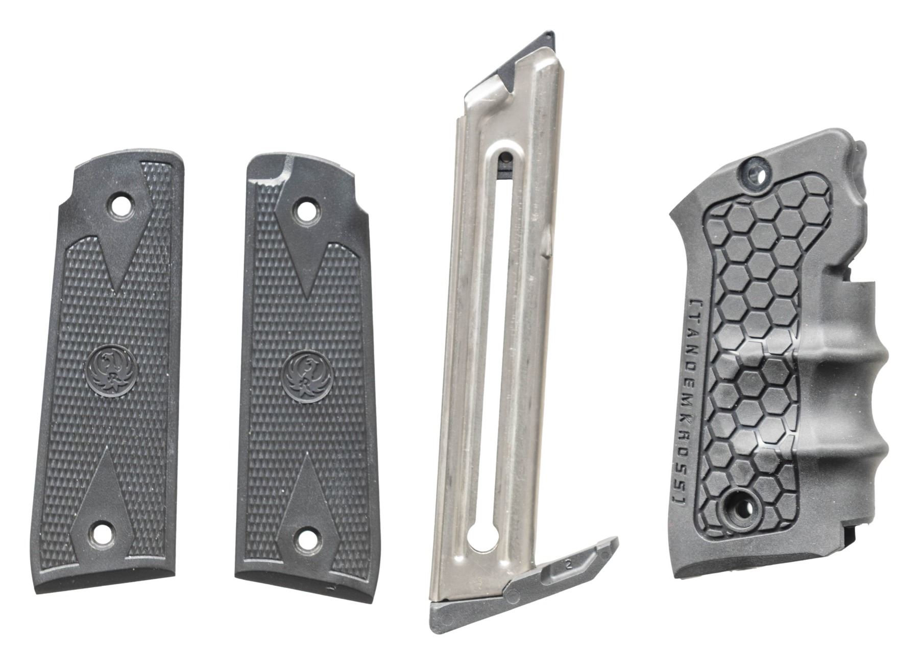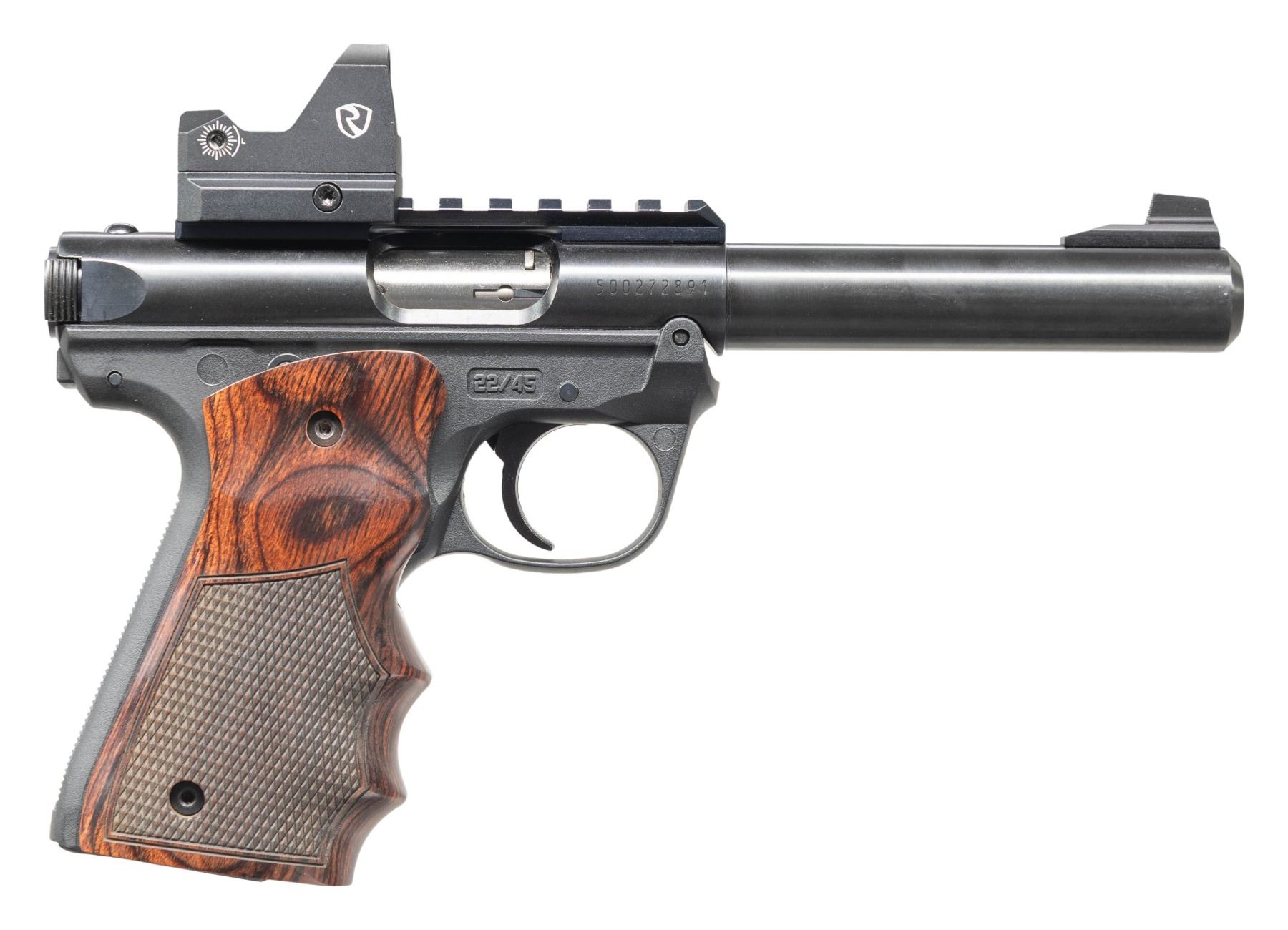 Cal. 22 LR. S# 500272891. Bbl. 5 1/2" cold hammer forged bull with recessed target crown and screw attached square serrated faced front sight. Fitted with Picatinny base having RITON 3 TACTIX PRD 3TPRD red dot reflex sight that has 3 MOA dot, 40,000 hour battery life and 4 hour auto shut off. Mfg. 2021 (2018 to date) as Model 40107 with polymer frame having simple push button take down. Tapered bolt cocking ears and reliefs on receiver. Push button magazine release for its drop free magazines plus extended safety and slide lock. Grips are oversized wrap around checkered finger grooved laminated rosewood by Altamont. MAGS: 2 factory 10 rd. UNATTACHED ACCESSORIES: matching numbered factory black plastic carry case with packaging to include original adjustable rear sight and Ruger logo 1911 style checkered black plastic grips plus Tandemkross black finger grooved rubber grips. CONDITION: all near excellent including all grips and bore. (25-6110/NW). MODERN. $300-450.