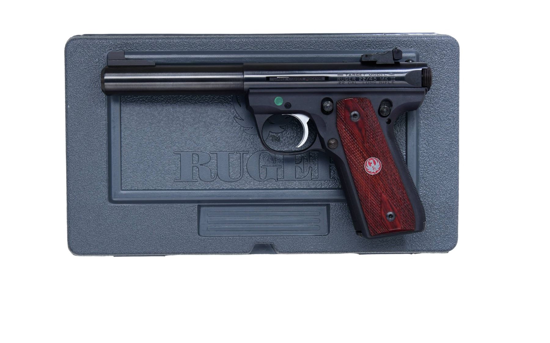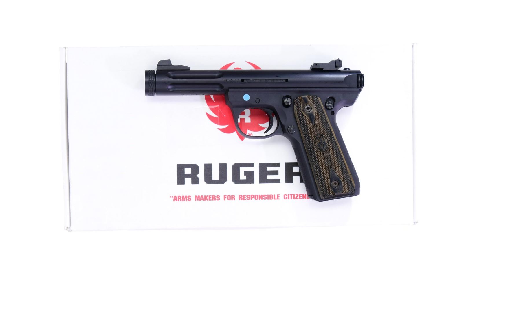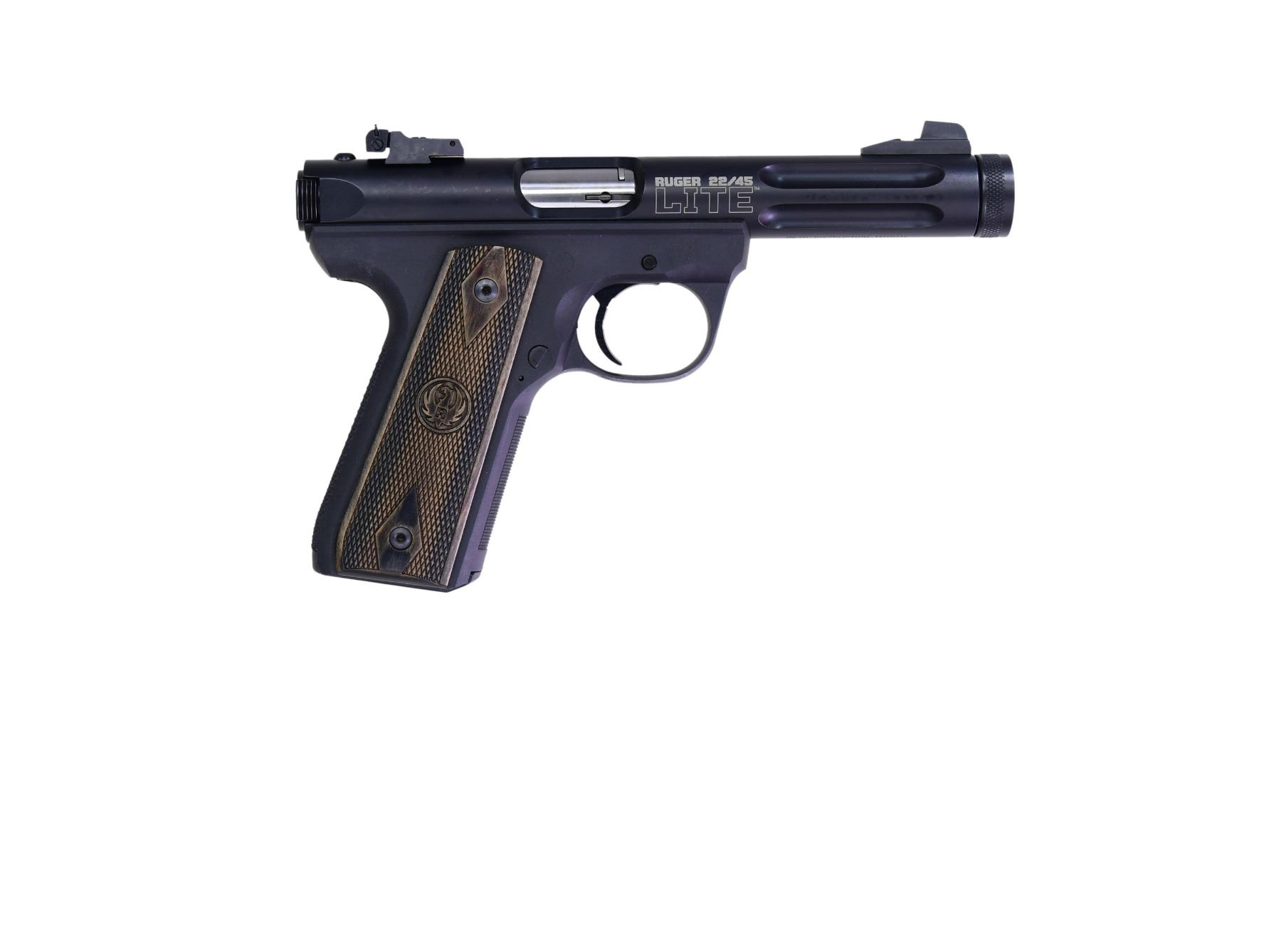 1) MARK III 22/45 LITE WITH MATCHING NUMBERED BOX. Cal. 22 LR S# 390-35512. Mfg. 2013 as Model 03903 & Catalog No. P45MK3ALRPFL. Blued finish with 4.5" fluted, threaded barrel. Black polymer checkered grips. MAGS: 2-10 Rds. UNATTACHED ACCESSORIES: Factory box, instruction manual, and additional paperwork. CONDITION: Near excellent condition. Bore is clean with sharp rifling. (24-2894/MD).