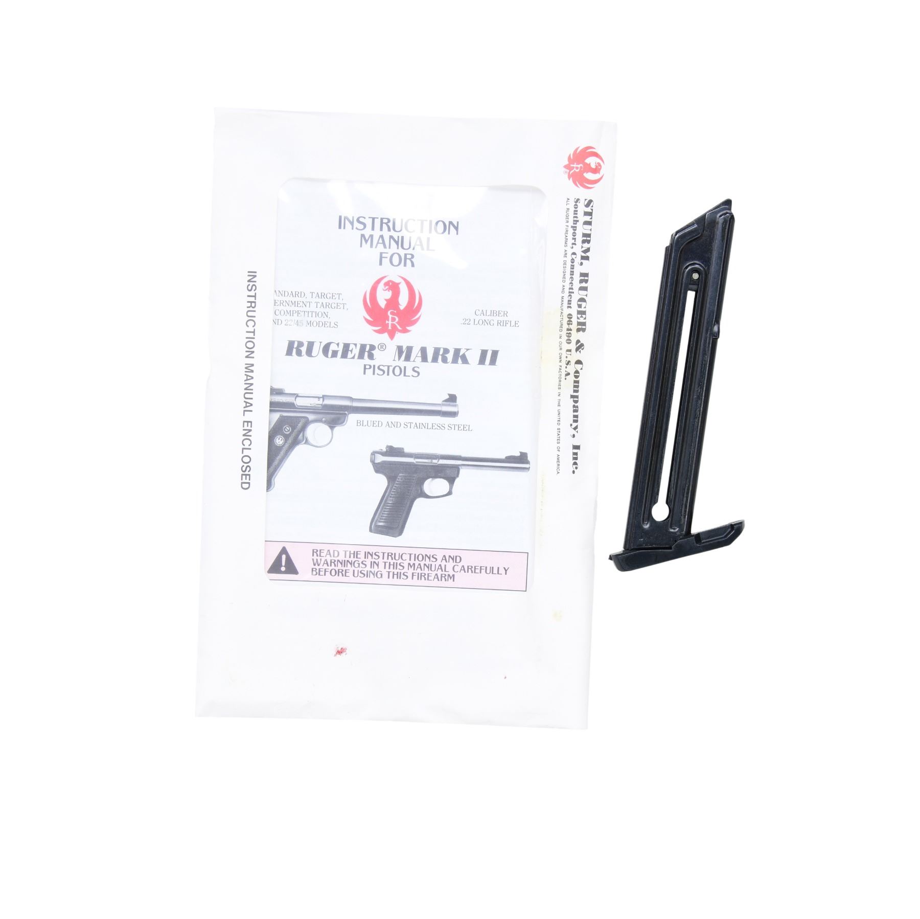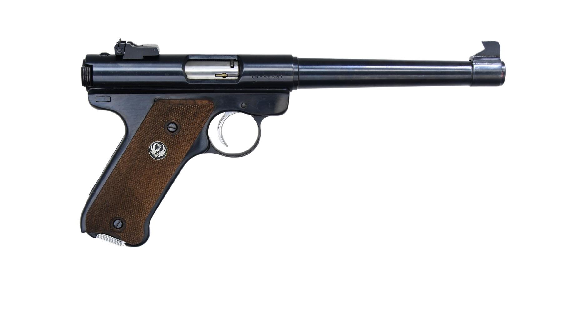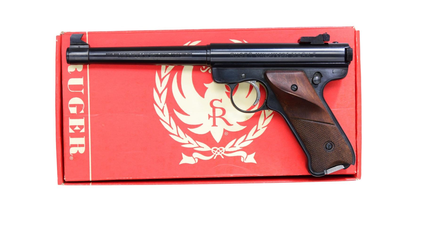 PISTOLS. 1) MARK I TARGET WITH MATCHING BOX. Cal. 22 LR S# 15-42561. Mfg. 1979 as Catalog No. T-678. Blued finish. Bbl. 6.875". Checkered walnut grips with thumb rest on left panel & Ruger medallion on right panel. MAGS: 1-9 Rds. UNATTACHED ACCESSORIES: Factory box and packaging. CONDITION: Very good overall showing light wear; bore is bright and sharp. (24-2891/MD)