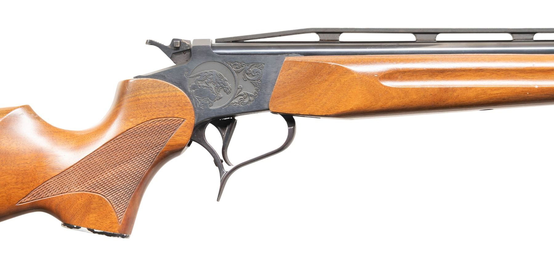 Cal. 410 Ga. 3". S# 90560. Bbl. 21" gloss blued having screw in choke (measures Full) plus grooved ventilated rib with bead front sight. Very rare barrel offering contributing substantially to the total value of this lot; Rochester barrel markings. Mfg. first half of 1978 (1967-2000) having engraved Puma on each side of its non easy open frame. Hammer has cross bolt safety, skeletonized shape and caliber selector in its face. Classic satin finished stock set with 2 screw attached forend having finger grooves on sides. Checkered buttstock with solid red pad and black grip cap having raised Puma figure. Rare offering in shotgun configuration. CONDITION: very light handling marks on stock set plus missing some black paint on cast Puma grip cap. Cross bolt hammer safety is difficult to operate and should have gunsmith attention before use; all other aspects near excellent. PROVENANCE: Estate of Groves (25-5752/NW). MODERN. $650-900.