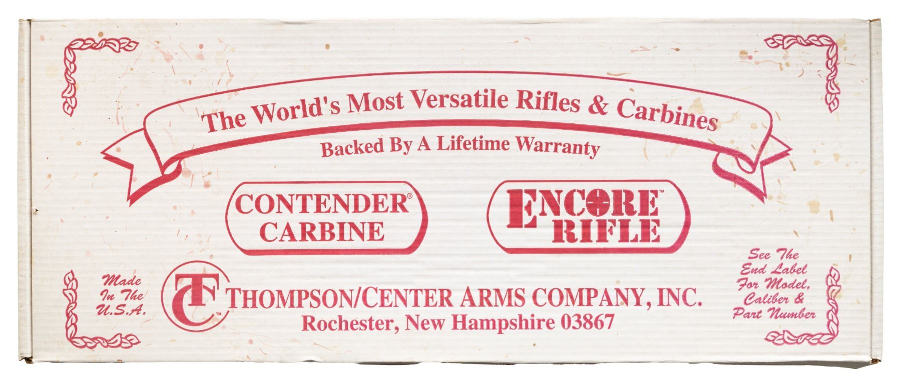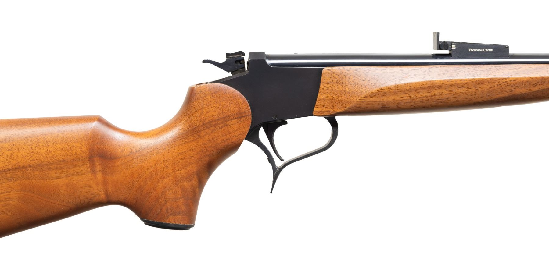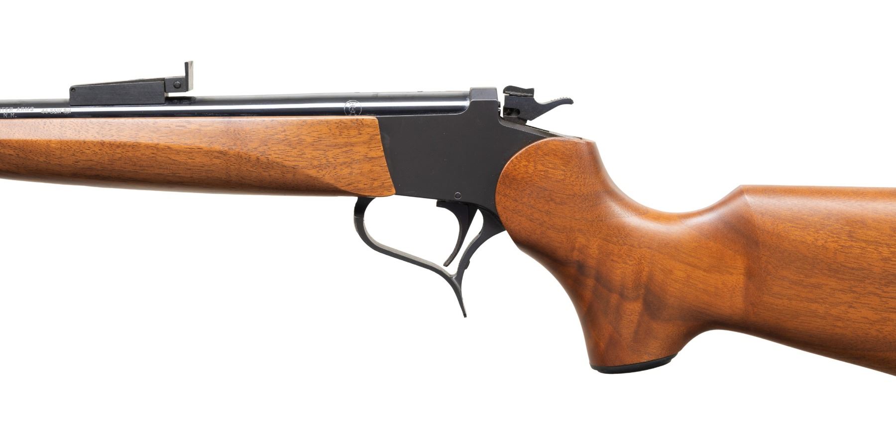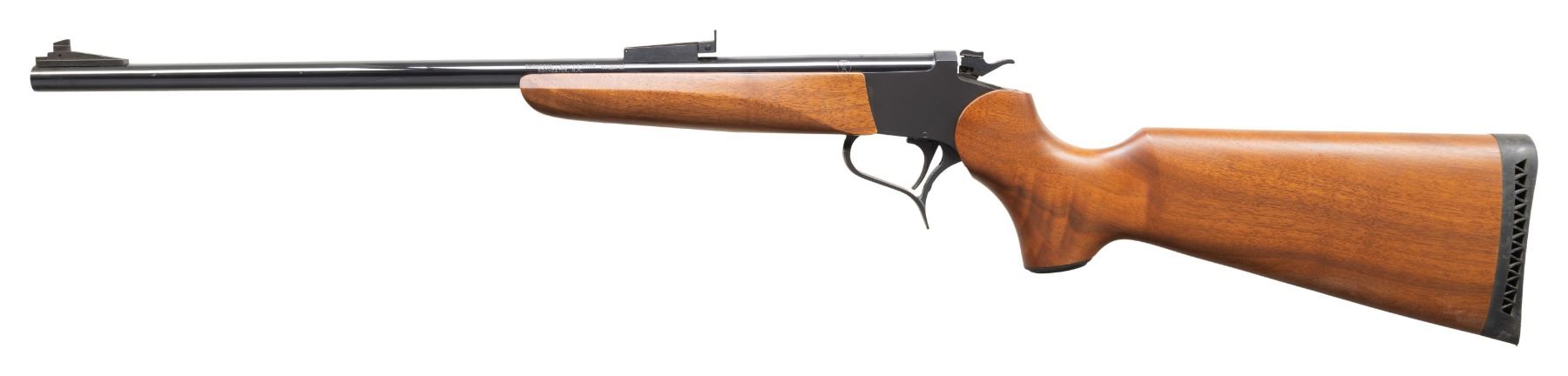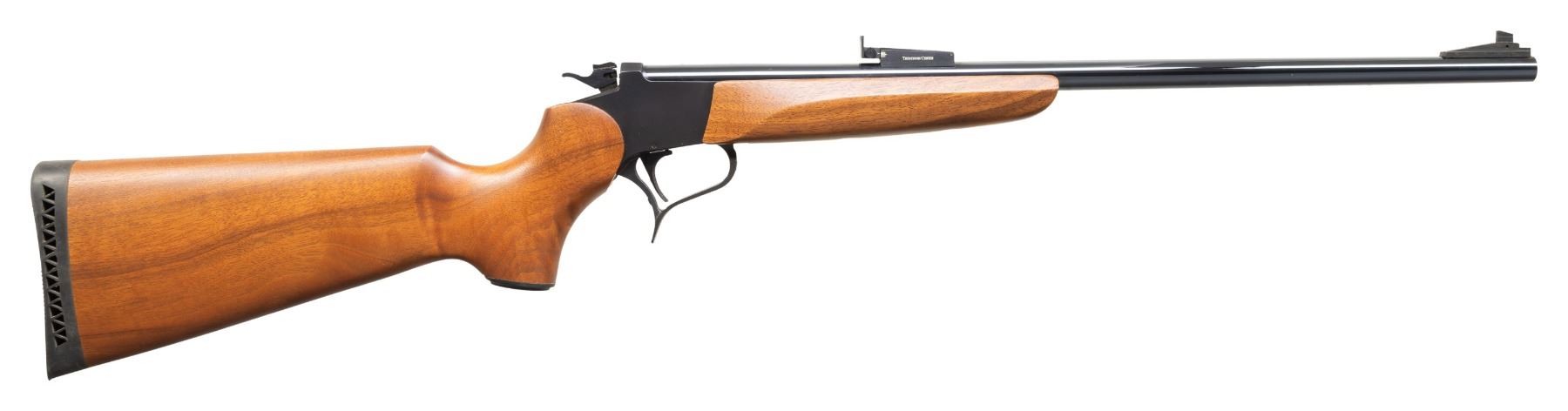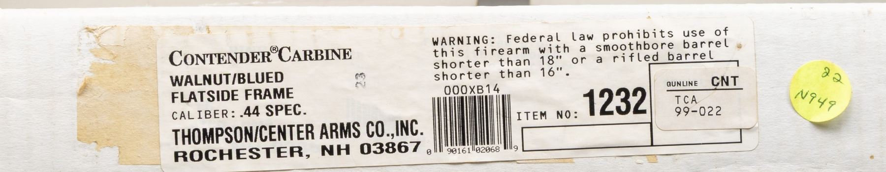 SINGLE SHOT CARBINE. Cal. 44 Spl. S# TCA 99-022. Bbl. 21" gloss blued having screw attached adjustable sights plus drilled and tapped for scope base with plug screws installed. Rare caliber offering known for its accuracy with TCA logo and Rochester markings. Mfg. 1999 as special association offering having matte finished easy open flat sided frame of which internet research states only 36 were made; this is #22. Hammer has top selector / safety switch. Classic satin finished stock set with 2 screw attached forend plus buttstock with ventilated black pad and black grip cap having silver intertwined "T" and "C". Rare offering in especially rare caliber. UNATTACHED ACCESSORIES: original matching numbered box with manual; no spacing foam and stained spots on lid. CONDITION: all aspects near excellent with new, unfired appearance. PROVENANCE: Estate of Groves (25-5747/NW). MODERN. $550-800.