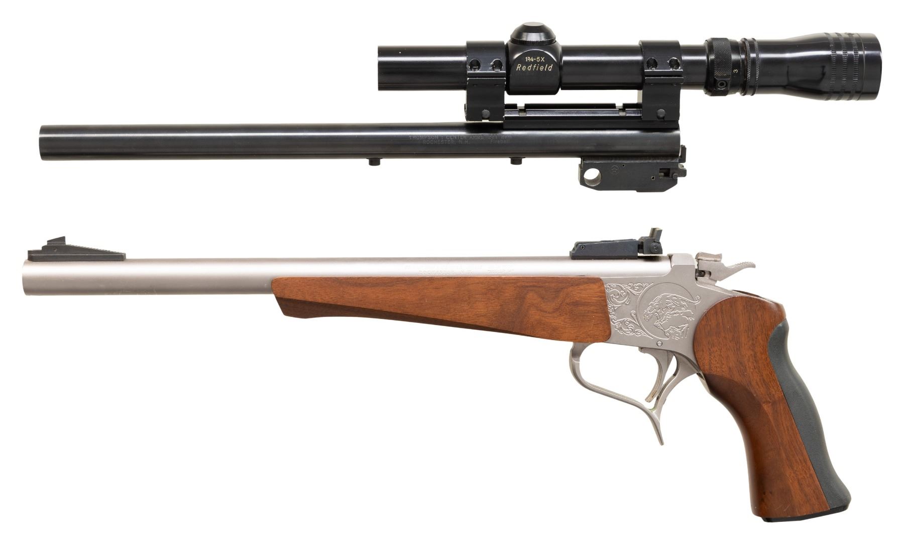SHOT PISTOL WITH EXTRAS. Cal. 30-30 Win. S# A10228. Bbl. is Armour Alloy Super 14 with blued screw on adjustable sight set. Mfg. first half of 1989 (1986-1989) with electroless hard chrome plating that is actually superior to stainless both in regards to hardness and element resistance. Generally, blued and stainless barrels are not useable with this model unless the hole size of the pivot pin is altered (by gunsmith or factory) such as was done on this one. Selector / safety on top of hammer and easy open frame configuration with Puma on each side. Smooth satin finished stock set with black cushion at rear of grip plus black plastic grip cap having intertwined "T" and "C". UNATTACHED ACCESSORIES: matching numbered box for pistol frame to include styrofoam inserts. Blued 14" (not marked "Super 14) barrel without provision for sights having recessed target crown and improved split locking bolt. Fitted with Weaver base, economy alloy 1" scope rings and gloss finished Redfield Widefield 1 3/4-5 duplex reticle scope. Some light marks around rings and scope exterior; balance including bore and optics is near excellent. Very good black nylon zippered carry case with internal compartments. CONDITION: all aspects near excellent including bore. PROVENANCE: Estate of Groves Herrick. (25-5655/NW). MODERN. $650-900.