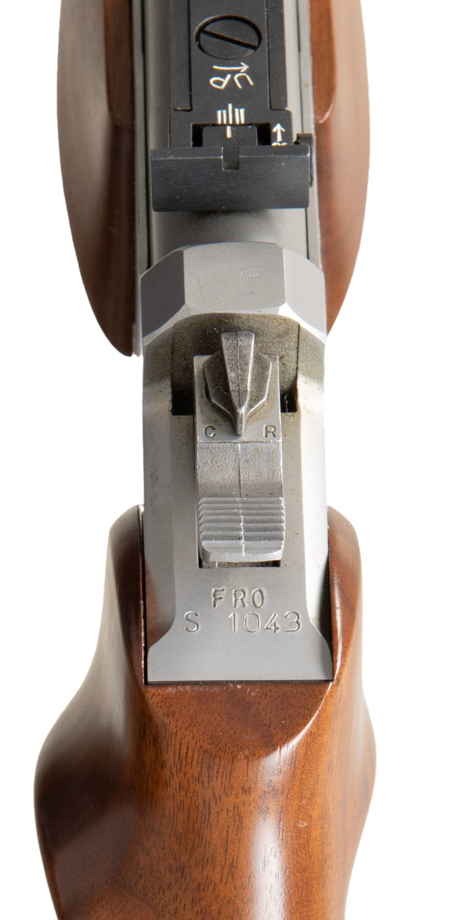 "FLAT SIDE" SINGLE SHOT PISTOL. Cal. 22 LR. S# FRO S 1043. Bbl. 10" octagon stainless with fixed blued front sight and factory adjustable rear; marked "22 L.R. Match" having Rochester address plus recessed target crown. Special flat side 3rd. variation of easy open frame with selector / safety on top of hammer. Issued by T/C Custom Shop, AKA Fox Ridge Outfitters (FRO). Serial number prefix of "FRO" and "S" for stainless. Front of frame marked "TCA-C" over "ROCH-NH". Original Contenders started with serial number 1001, so one might assume this special model may have also started at 1001, making this #43 (Richard Petty fans?). Walnut stock set of sculptured forend and Herrett style finger grooved grip with TC marked black plastic grip cap. CONDITION: careful scrutiny will yield some very faint handling marks, but overall near excellent with unfired appearance. PROVENANCE: Estate of Groves Herrick. (25-5697/NW). MODERN. $500-750.