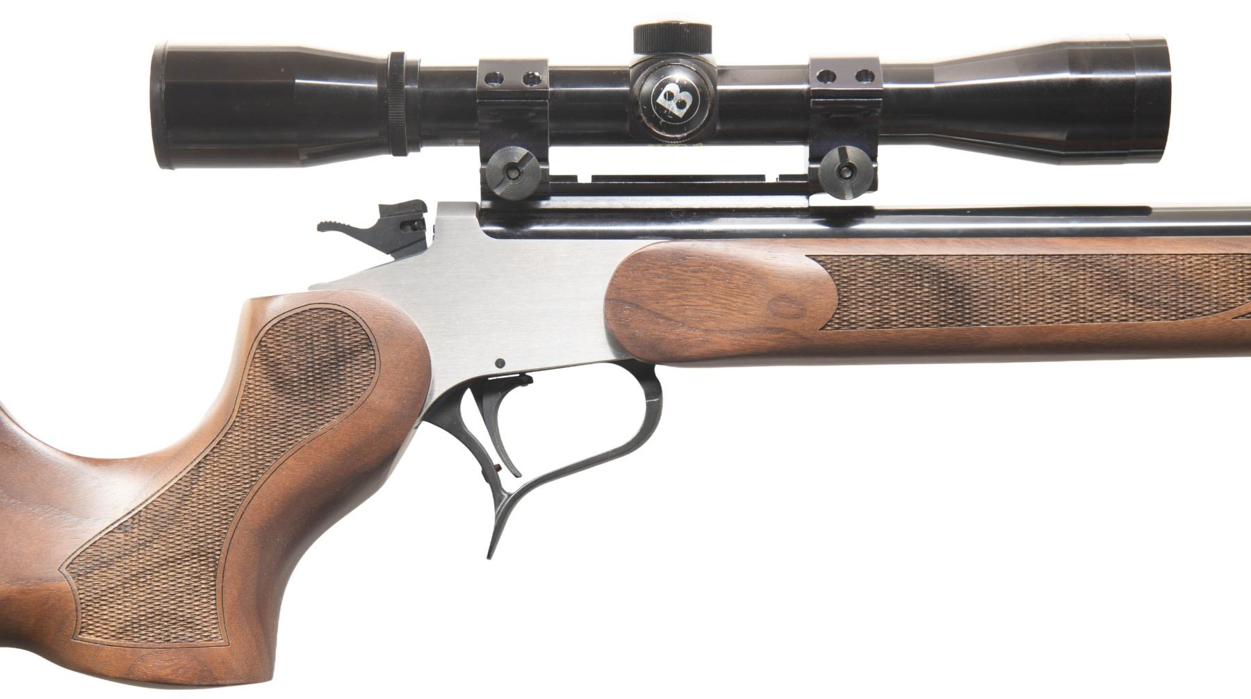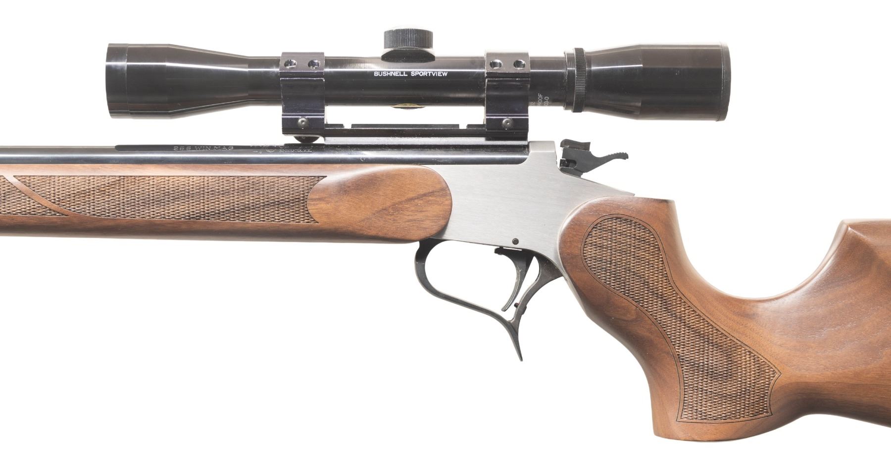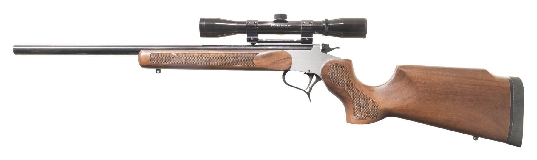SHOT RIFLE. Cal. 22 LR. S# 1438. Fitted with gloss blued T/C Custom Shop (Rochester marked) 21" heavy sporter barrel having recessed target crown plus Weaver scope base holding gloss black Bushnell Sportview 4X32 duplex reticle scope. Made in 2023 by SSK Firearms celebrating 50 years of the Thompson Center Contender which is 100% crossover compatible with Thompson Center Contender products including the newer G2. Frame is stainless steel with black nitride finished trigger guard; all other small parts are blued. Plain flat brush finished sides of its easy open frame. Long checkered satin finished walnut forend with uncheckered ribbon on each side and attached by 2 screws. Matching checkered Monte Carlo buttstock with black solid Kickeze recoil pad; fitted with sling studs. CONDITION: some occasional extremely light handling marks on the stock set with the balance near excellent including bore and scope set. PROVENANCE: Estate of Groves Herrick. (25-5759/NW). MODERN. $500-700.