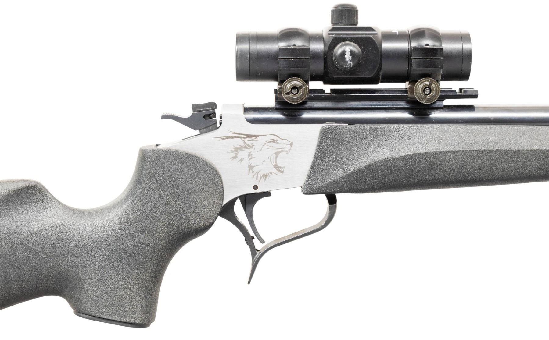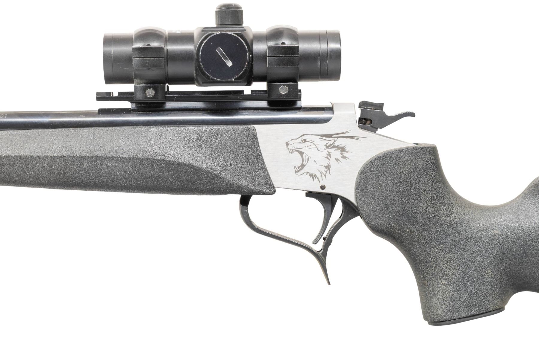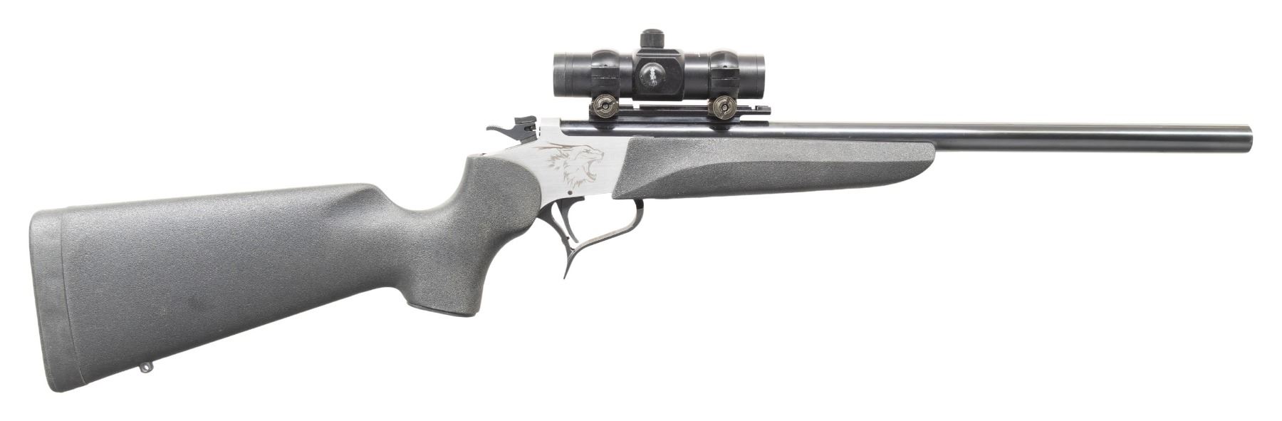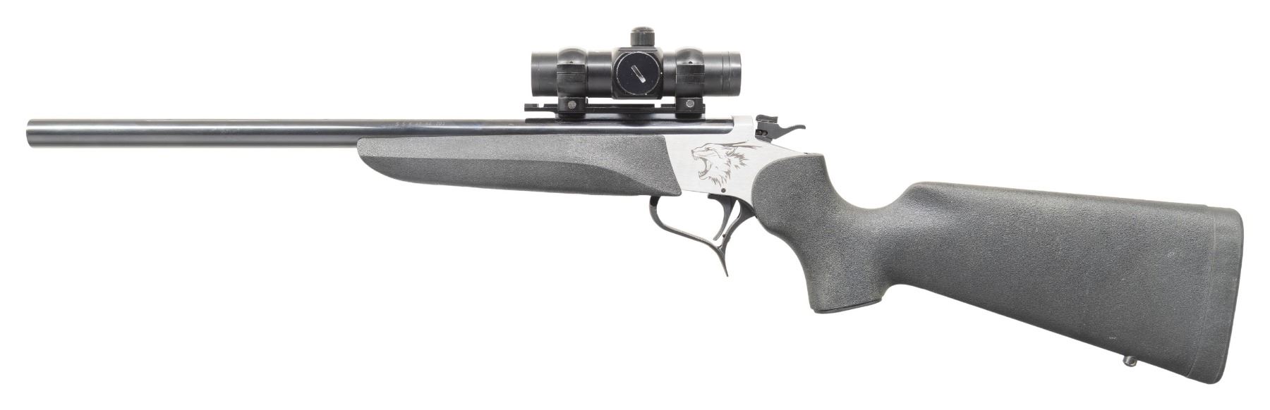 Cal. 40-44 JDJ. S# 1271. Blued 18" non tapered round barrel with 11 degree crown; Weaver scope base with Tasco Accudot red dot reflex sight in alloy 1" scope rings. Mfg. about 2022 (likely) or 2023 as recreation of easy open frame Contender. Stainless frame with laser engraved Puma on each side; blued triggerguard and hammer that has safety / selector on top. Wildcat caliber conceived by SSK founder JD Jones which is a Winchester 44-40 case necked down to accept a 40 caliber bullet. Stock set is Thompson Center Rynite black synthetic with recoil pad and sling swivel bases plus black plastic grip cap having intertwined "T" & "C". CONDITION: Barrel has pinprick oxidation throughout. Frame is near excellent with some thinning of triggerguard finish. Near excellent stock set, but forend does not correctly fit barrel as it was intended for a smaller diameter T/C barrel. Action is extremely difficult to open as the barrel latch fitment needs gunsmith attention. Barrel has the new split bolt but it will not open when triggerguard is pulled; functions with rubber mallet assistance. Frame checked with a T/C barrel and it functioned properly. Near excellent stock set and bore. PROVENANCE: Estate of Groves Herrick. (25-5756/NW). MODERN. $450-600.