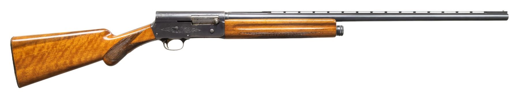 SHOTGUN. Cal. 16 GA, 2 3/4". S# 8S15373. Bbl. 27 9/16". A5 "Sweet Sixteen" semi-automatic shotgun mfg. in Belgium by Fabrique Nationale and imported/retailed by Browning Arms Company in 1958. Left side of the bbl. is marked with Browning's importer information, above Belgian commercial proofing, with "MADE IN BELGIUM" marked on the right. Sides of the receiver feature sections of foliate scroll engraving and wavy line borders, with "Sweet Sixteen" (Script) above "BROWNING" and a portrait of John Moses Browning on the left, and a triad of Belgian proofs on the right. Scrollwork extends to the receiver tangs as well as on the underside of the trigger guard bow. Metal components exhibit a blue finish overall, save for on the bolt assembly and mag. tube, which are polished in-the-white. Checkered wood finger groove forearm and rnd. knob buttstock with FN horn buttplate. Wood furniture has been sanded and revarnished at one time. Bbl. features a matte V/R with aluminum bead front sight and a fixed Modified choke (indicated via "**" preceding "SPECIAL STEEL" marking). CONDITION: metal components retain the majority of their original factory blue finish, exhibiting some areas of light to mild wear and thinning that are fading to gray patina (primarily on edges and contact points), some superficial handling marks, as well as scattered spots of light to mild surface oxidation overall. Bolt assembly exhibits scattered spots of oxidation and age related discoloration. Mirror bore, exhibiting several areas of hardened firing residue. Proper manual mechanics. Wood furniture is very good overall, as sanded and refinished. Buttplate exhibits a large crack through the top screw slot, with chipping and delamination present in the corresponding area. (25-5604/MLW). CURIO. $350-550.