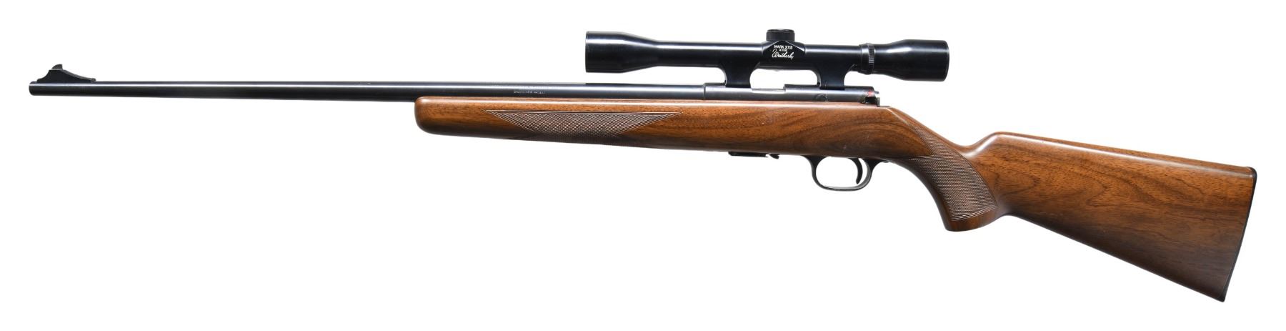 Cal. 22 LR. S# 63260X (factory overstamped "7" over "0"). Mfg. 1967. Bbl. 24" w/ FN & Browning address markings along with Belgian proofs. Blade front sight & open rear sight screw holes. Weatherby Mark XXII 4x50, duplex scope on receiver grooves. Checkered walnut stock. MAGS: 3- 5 rd. CONDITION: very good blue. Very good wood finish w/ handling marks & several deep dents on toeline. Very good bore. Scope has very good finish w/ serviceable optics. (25-3211/MD). CURIO. $250-350.