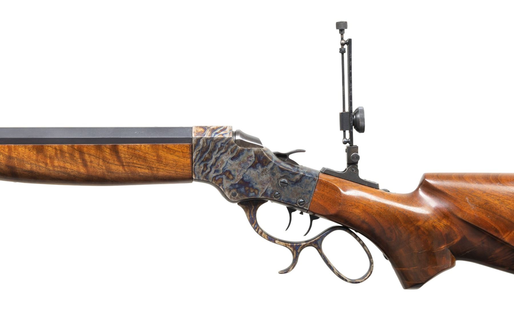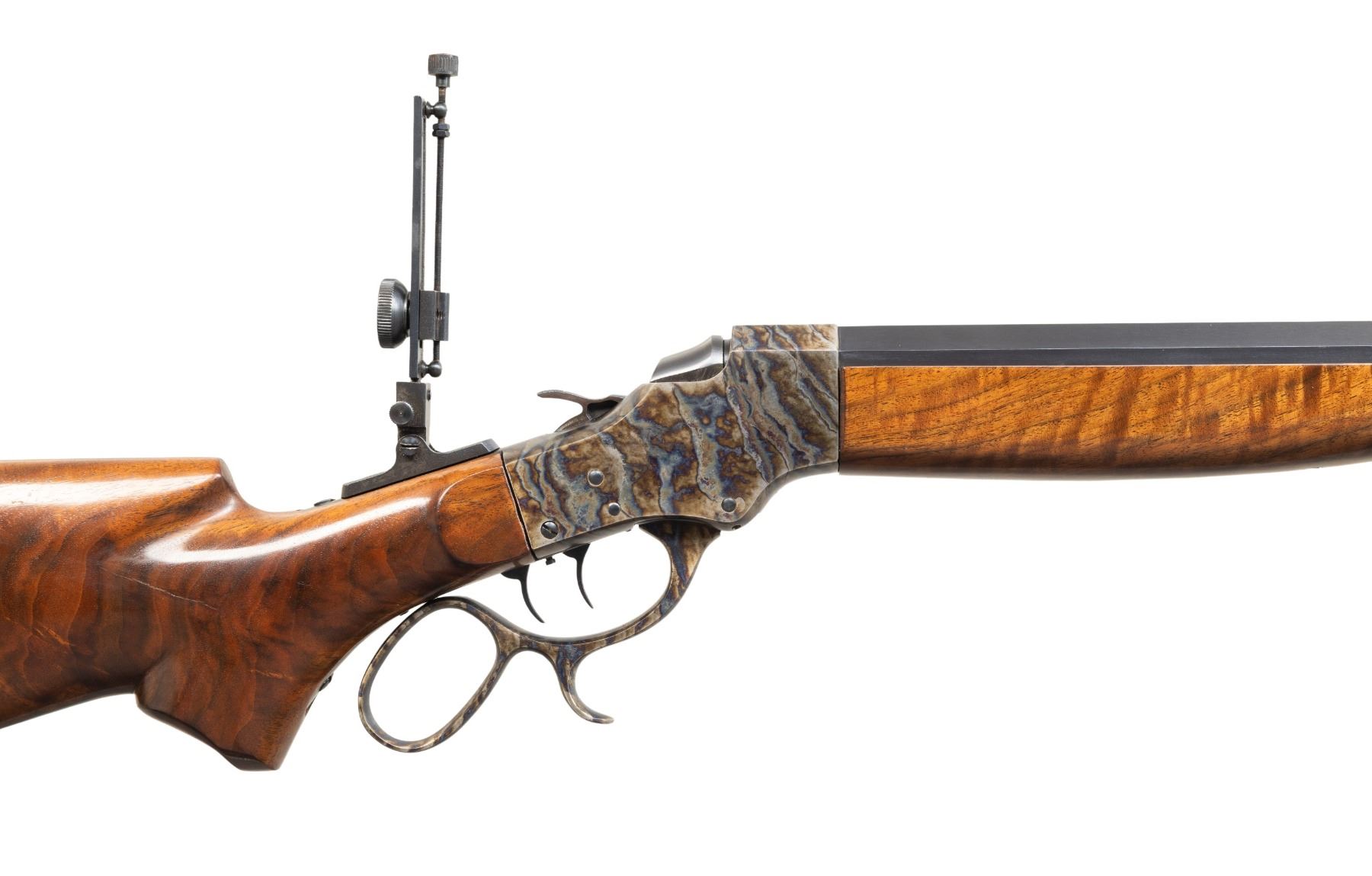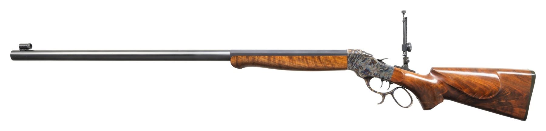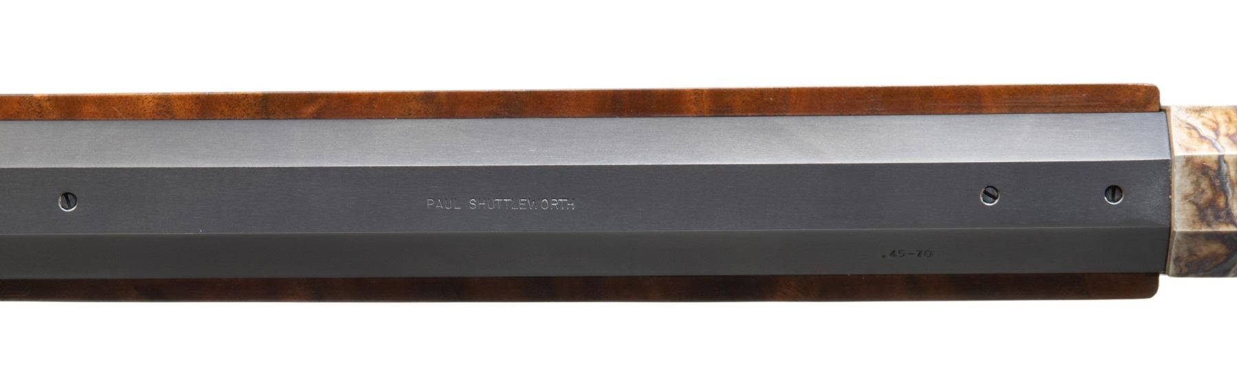RIFLE. Cal. 45-70. S# 1051. Bbl. 32" octagon (12") to slightly tapered (1.110" to 1.008") round (20") with Lyman #17 globe front sight; Soule style (unknown maker) long range rear sight (very similar to MVA #100) on tang. Octagon section is drilled and tapped (plug screws present) at proper 7.2" spacing for target blocks. Bottom of barrel is marked "Badger" along with "1-18" (twist rate), "5R" (type of rifling) and "5-16-05" (date). Improved version of Stevens Model 44-1/2 by Paul Shuttleworth (1929-2022) using investment cast 8620 steel and modern CAD machining methods starting in 1986. Walls of action are slightly thicker than the Stevens for more strength. Fitted with double set triggers plus ball and spur lever without wood inserts. Besides the quality appearance and smoothness of its action, the hammer has lightening machining on its sides for reduced lock time. Action and lever are superbly case colored and very vivid. Satin blued barrel with polished in the white muzzle to show grease streaks. Finely fitted, gloss finished, uncheckered stock set with slight schnable on forend plus pistol grip buttstock having straight comb, S shaped bottom of pistol grip, raised RH cheekpiece and Stevens marked checkered black plastic buttplate; all with great figure in the wood. Channel of forend has action serial number and "4P". A wonderful classic in a very good caliber that is sanctioned for shooting NRA Silhouette matches. CONDITION: the finish of the stock set has some very slight spots of checking that will very likely come back to life with extremely fine wet sanding and additional hand rubbed finish. Repaired hairline crack on forend from rear screw to action. Metal finish and bore are near excellent. (25-5612/NW). MODERN. $1,750-2,500.