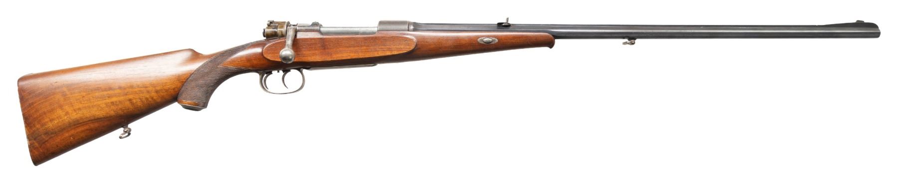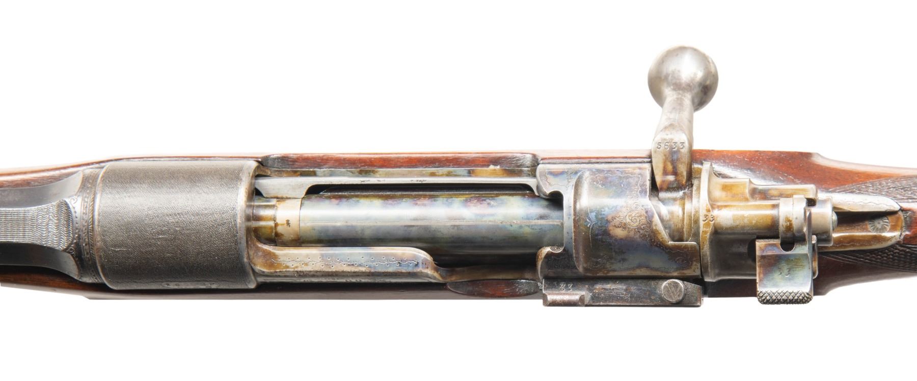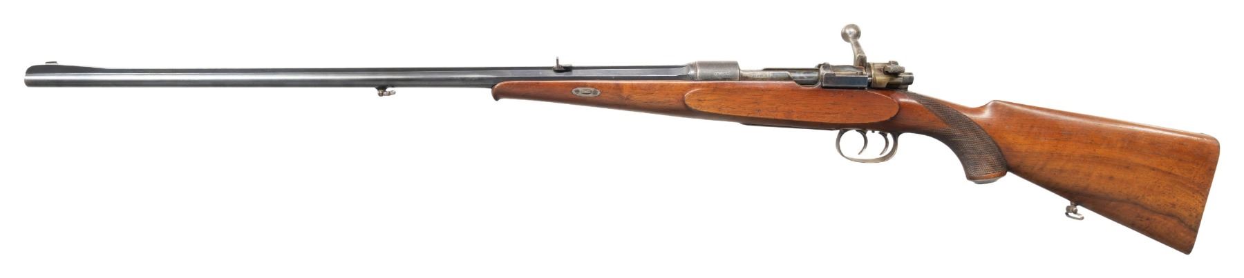 RIFLE. Cal. 8mm Mauser. S# 25150 (on bottom of receiver). Sporting rifle patterned after the Mauser Model B rifle built from a Military GEW 98 action (S# 5633). Bbl. 27" w/ matted rib having blade front sight & 2 leaf rear sight. Matching numbers throughout case hardened action w/ dbl. set triggers & control feed bolt assembly having turned down handle. Chamber ring has punch dot decoration with sprays of acanthus scroll engraving. Checkered walnut wedge fastened walnut stock w/ case hardened steel buttplate, grip cap, sling swivel. CONDITION: good fading barrel blue mixing with brown patina showing streaks of wear, marks & peppery oxidation. Good fading case colors with peeling varnish, patina & peppery oxidation. Good wood finish with numerous dings, marks that pierce the finish & sm. cracks behind action tang. Fair worn rifling. (25-5486/MD). CURIO. $500-800.