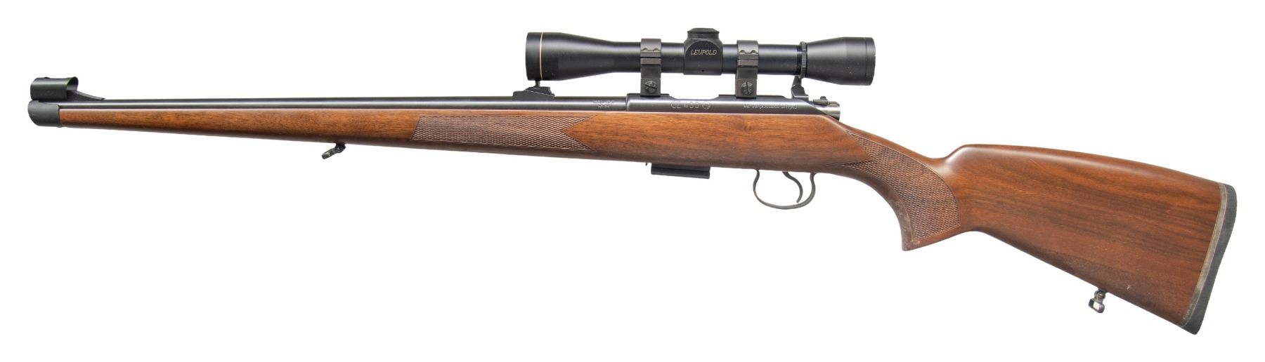 WITH LEUPOLD SCOPE. Cal. 22 MAG. S# C211311. Mfg. 2017 in Czech Republic & imported by CZ-USA. Bbl. 20.5". Sporting iron sights. Leupold M8 4x duplex scope on tall rings. Full length checkered Turkish Walnut stock w/ swivels & black pad. MAGS: 1 - 5 rd. CONDITION: near excellent metal finish. Very good wood finish with minor handling marks, oxidation on sling & residue on bottom surfaces of grip. Very good rifling. (25-4758/MD). MODERN. $400-600.