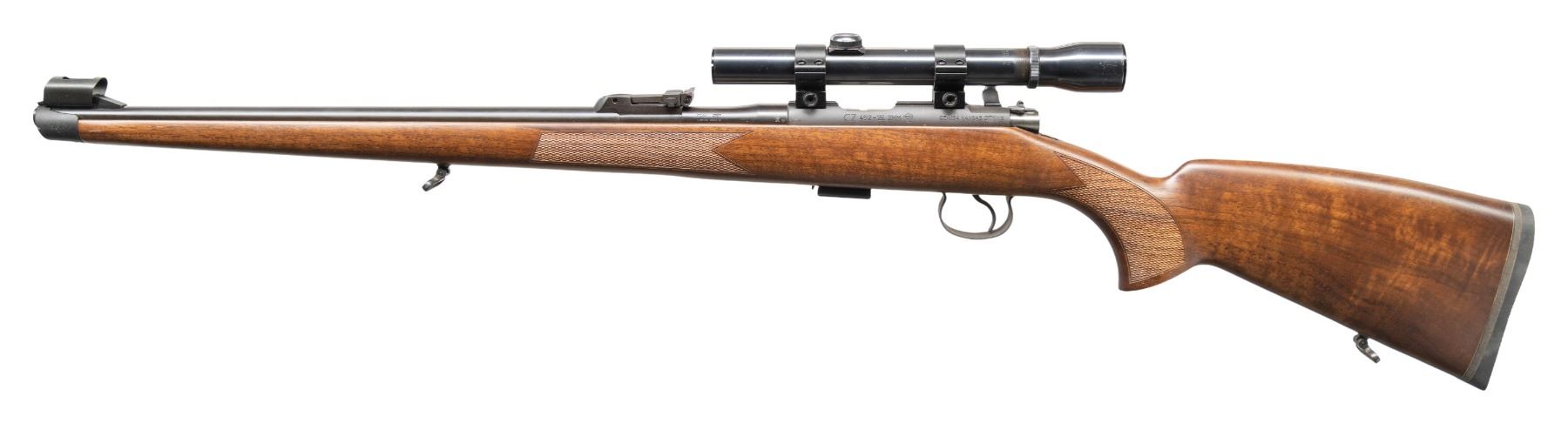 Cal. 22 LR. S# A430119. Mfg. 2008 in Czech Republic. Bbl. 20.5". Hooded blade front sight & tangent rear sight; Weaver K2, fine crosshair scope on alloy rings. Mannlicher walnut stock w/ swivels & black pad. MAGS: 1- 5 rd. CONDITION: near excellent metal & wood finish with light handling marks. Very good rifling. Scope has very good finish with lightly cloud optics. PROVENANCE: From the PMRB Collection. (25-5857/MD). MODERN. $500-800.
