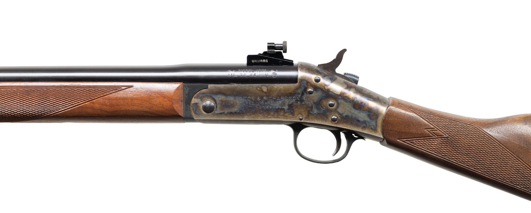 BREAK ACTION RIFLE. Cal. 38-55 Win. S# HU212661. Bbl. 28 1/16". Model 1871 single shot break action rifle mfg. by Harrington & Richardson. Left side of the bbl. is marked "~MODEL 1871~/ CAL. 38-55 WIN", followed by an encircled "P" proof. Left side of the receiver is marked with H&R's mfg. and patent information above the S#. Receiver and buttplate exhibit a case colored finish, with remaining metal components exhibiting a blue finish. Checkered wood forearm and straight grip stock with plain steel buttplate. Dovetailed globe front sight with Williams adj. aperture rear sight. Bbl. is factory drilled and tapped with 2 holes, the rear hole currently fitted with the Williams sight. CONDITION: metal components retain the vast majority of their original factory finishes, exhibiting some light superficial handling marks and a couple of spots of light surface oxidation, with areas of grease present in protected areas. Mirror bore, retaining strong rifling throughout. Proper manual mechanics. Wood furniture shows a few marks and minor impressions from handling and storage, but otherwise remains very good overall. PROVENANCE: Estate of Groves Herrick. (25-5768/MLW). MODERN. $300-500.
