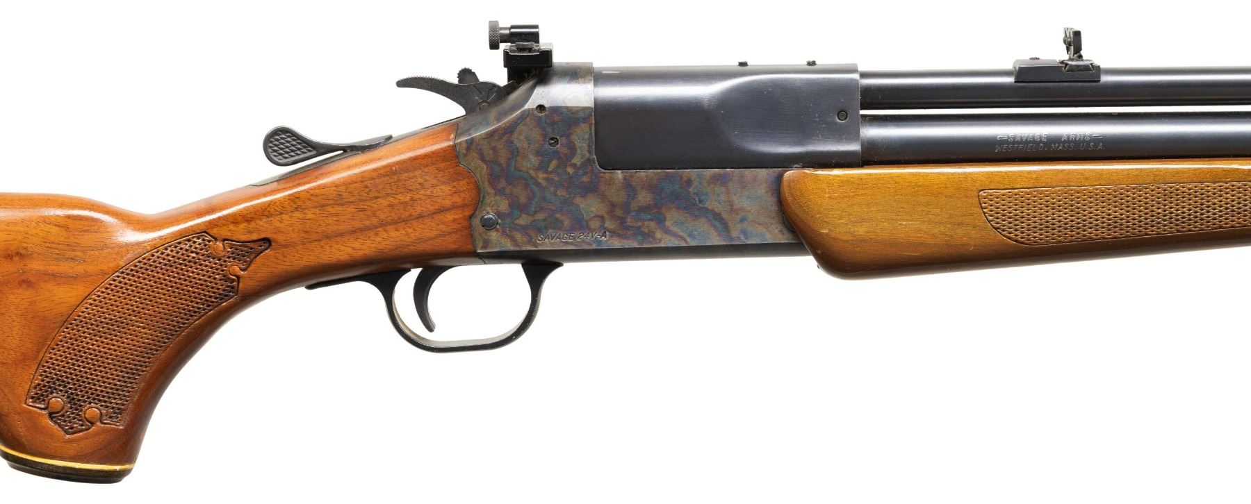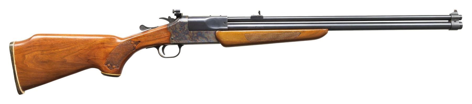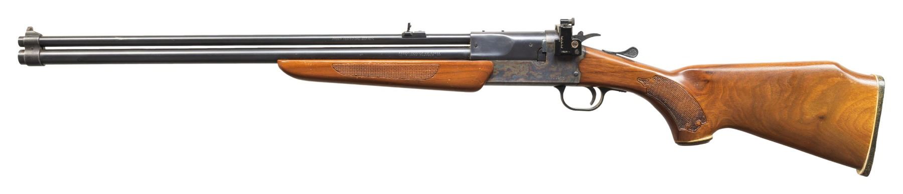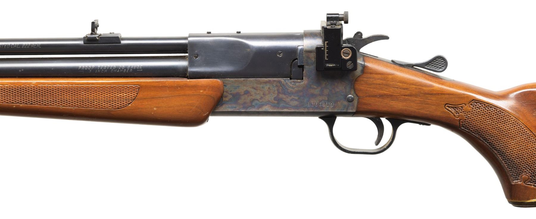 Cal. 222 Rem. / 20 Ga., 3". S# B360919. Bbls. 24". Blade front sight, folding rear sight & Williams receiver sight. Case colored action w/ top lever opening & selector on hammer. Press checkered walnut stock set w/ replacement buttplate. CONDITION: very good blue. Very good case colors. Good finish on forearm. Sanded & refinished stock has 2 repaired cracks. Shiny bores w/ 2 ring bulges in shotgun bore. PROVENANCE: Estate of Groves Herrick. (25-5640/MD). MODERN. $300-500.