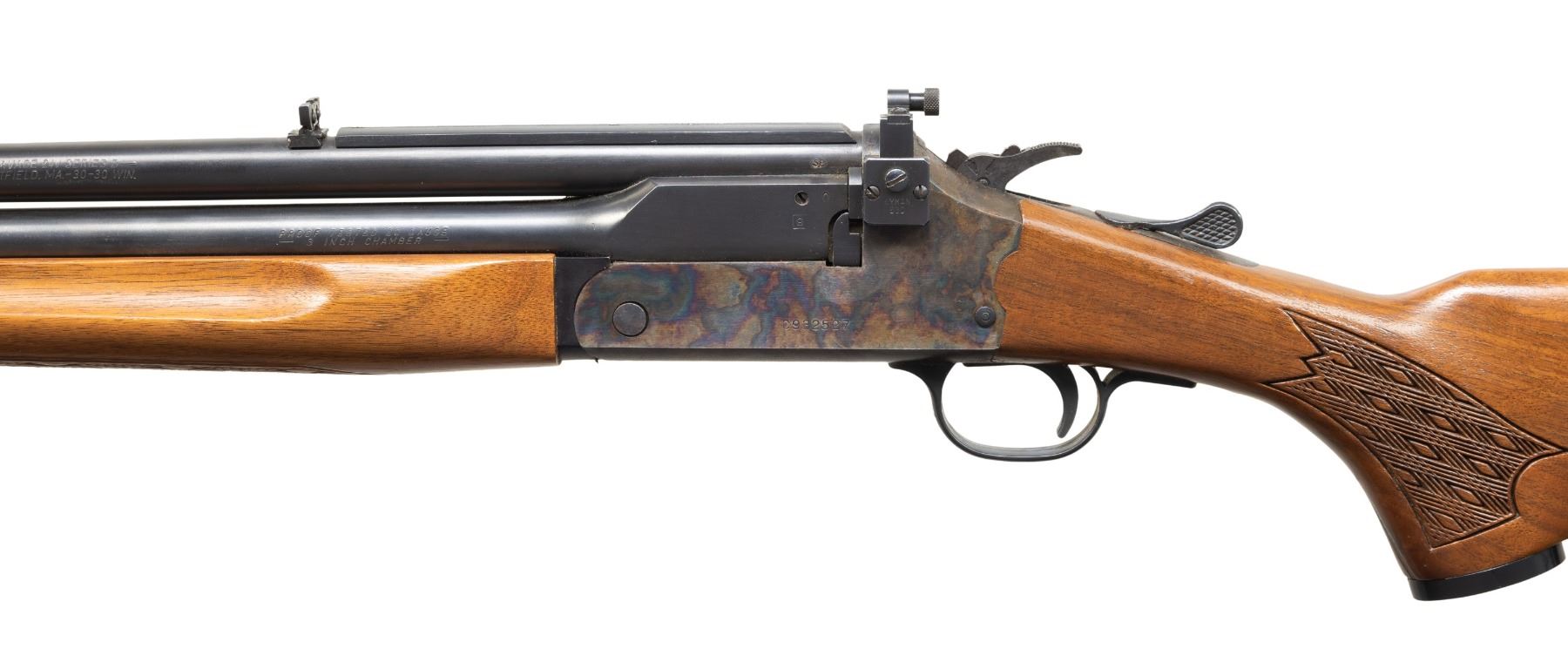 Cal. 30-30 / 20 Ga., 3". S# C932527. Bbls. 24". Blade front sight, folding rear sight & Lyman 53D receiver sight. Case colored action w/ top lever opening & selector on hammer. Press checkered walnut stock set w/ replacement buttplate. CONDITION: very good blue. & case colors. Very good finish on wood w/ chipping of plastic forearm attachment piece & factory appearing epoxy repair bottom of grip. Shiny bores. Red paint on front sight blade. PROVENANCE: Estate of Groves Herrick. (25-5644/MD). MODERN. $500-750.