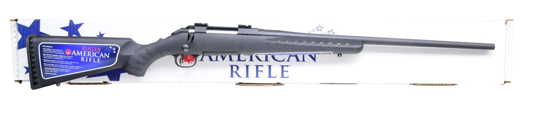 2) RUGER AMERICAN BOLT ACTION RIFLE WITH MATCHING BOX. Cal. 7mm-08 Rem. S# 691-06958. Mfg. 2013 as Model 06906. Matte black finish. Bbl. 22". Black synthetic stock. CONDITION: near excellent overall including rifling. (24-3655/MD). ALL MODERN. $500-800.