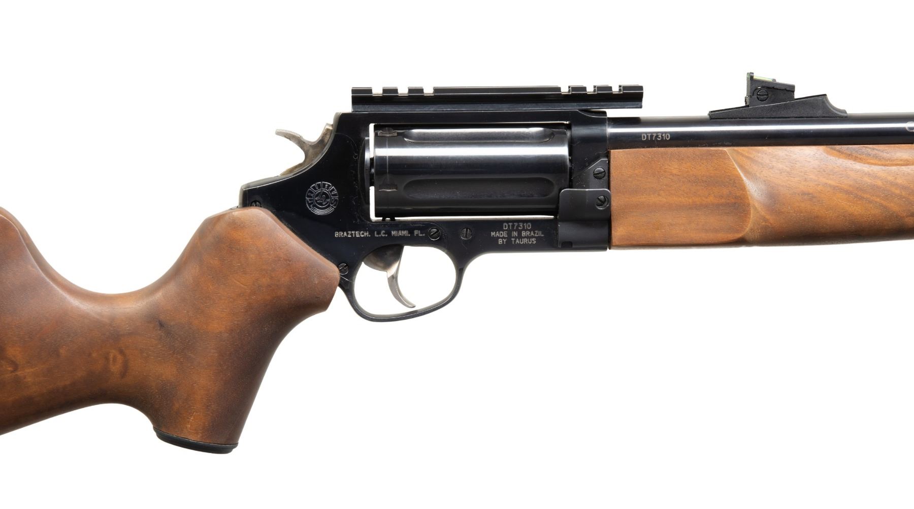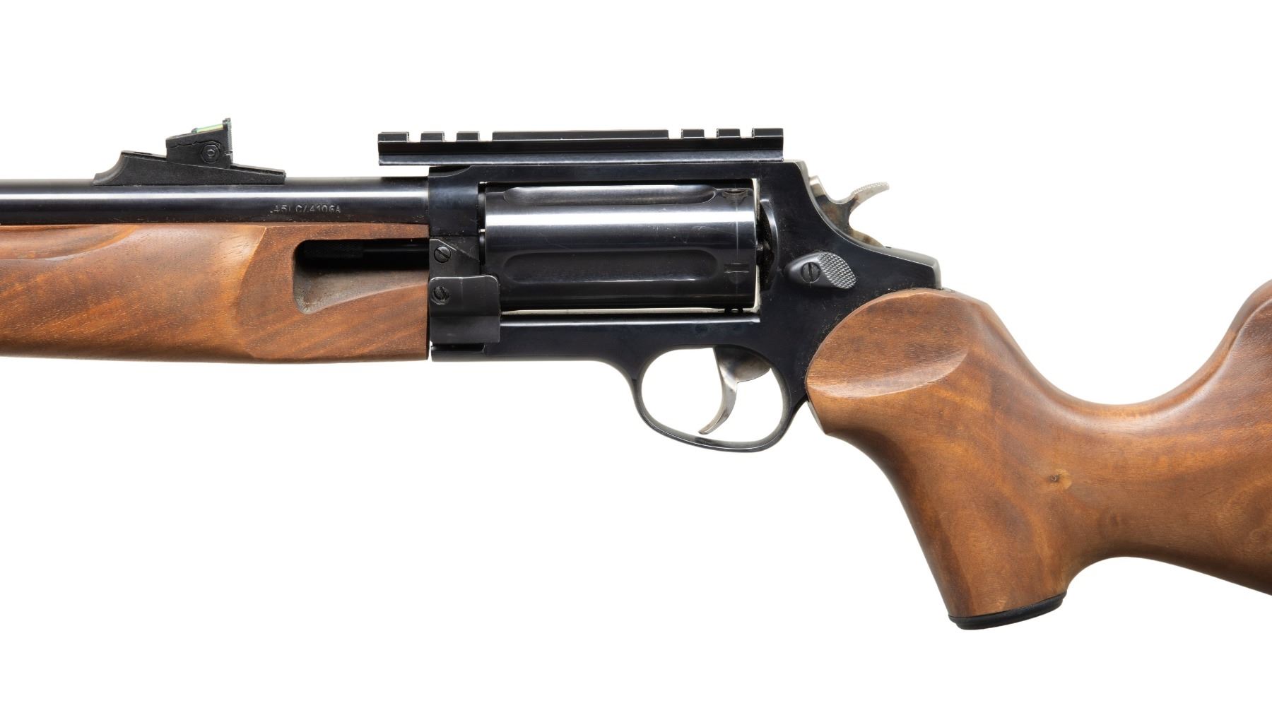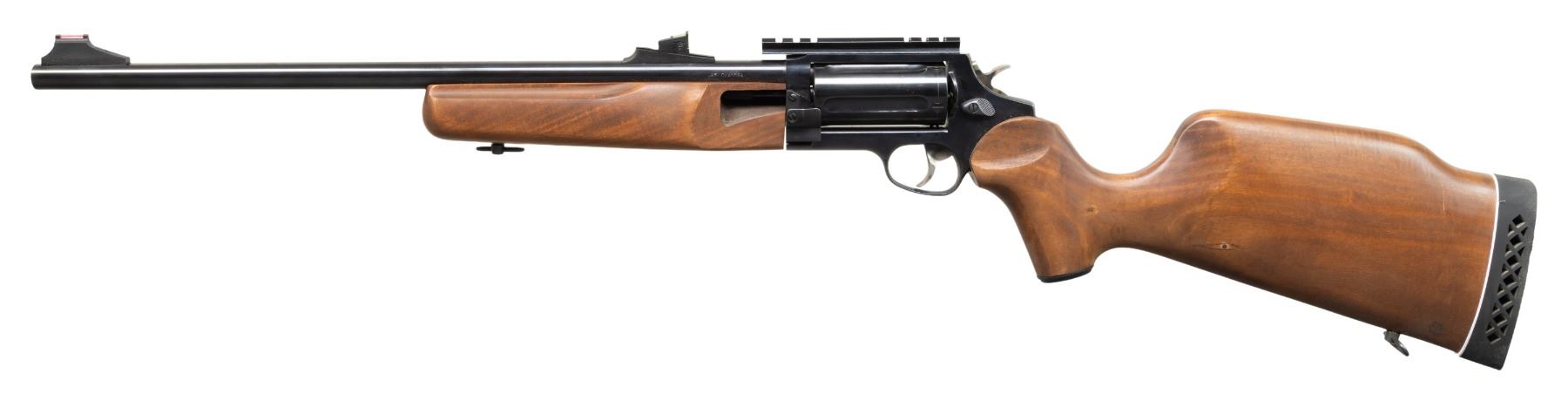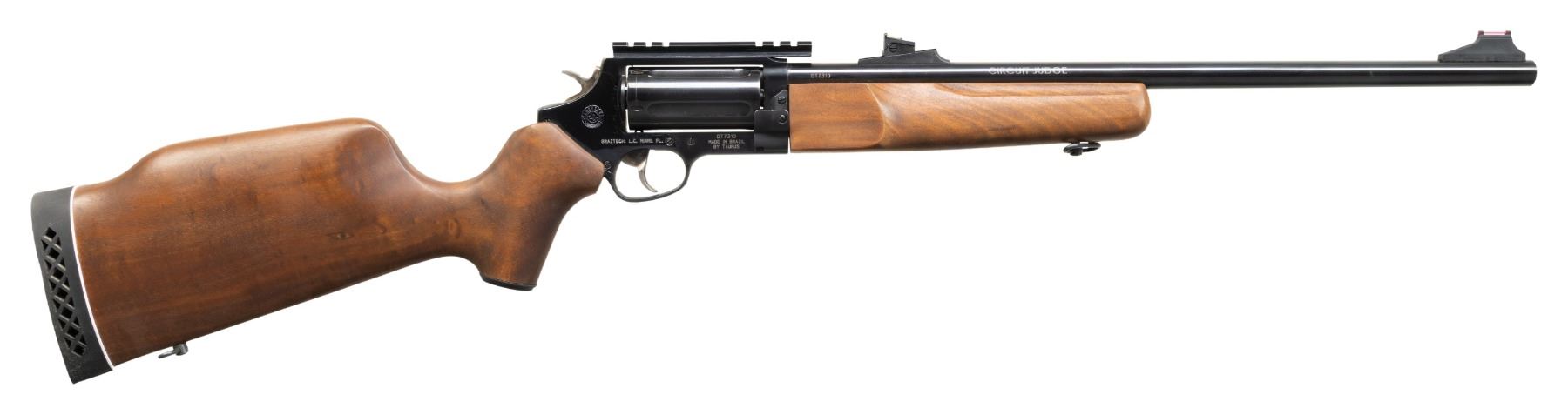 1) CIRCUIT JUDGE REVOLVING. CAL. 45 LC / 410. S# DT7310. Bbl. 18.5" w/ counterbored choke tube. Fiber optic sights. 5 Shot fluted cyl. Brazilian hardwood stock set w/ Monte Carlo comb & black pad. CONDITION: near excellent overall appearance including bore. (25-5894/MD).