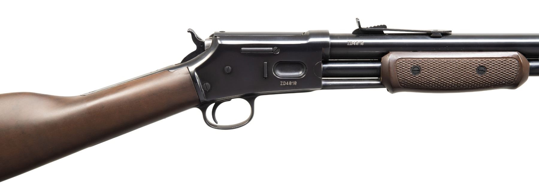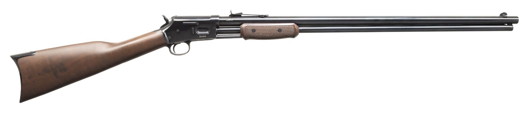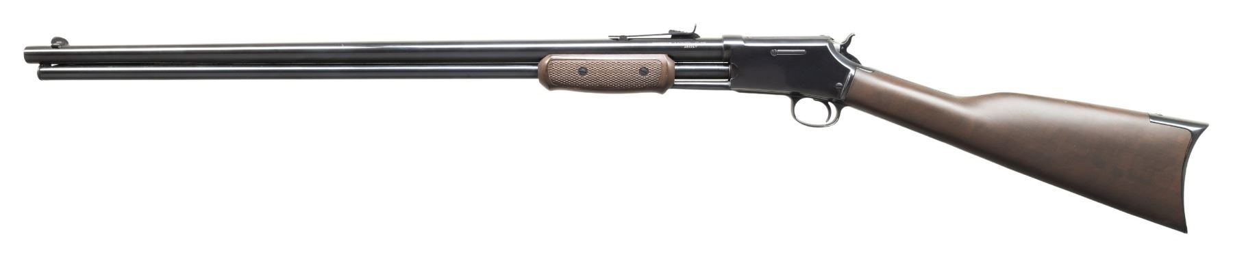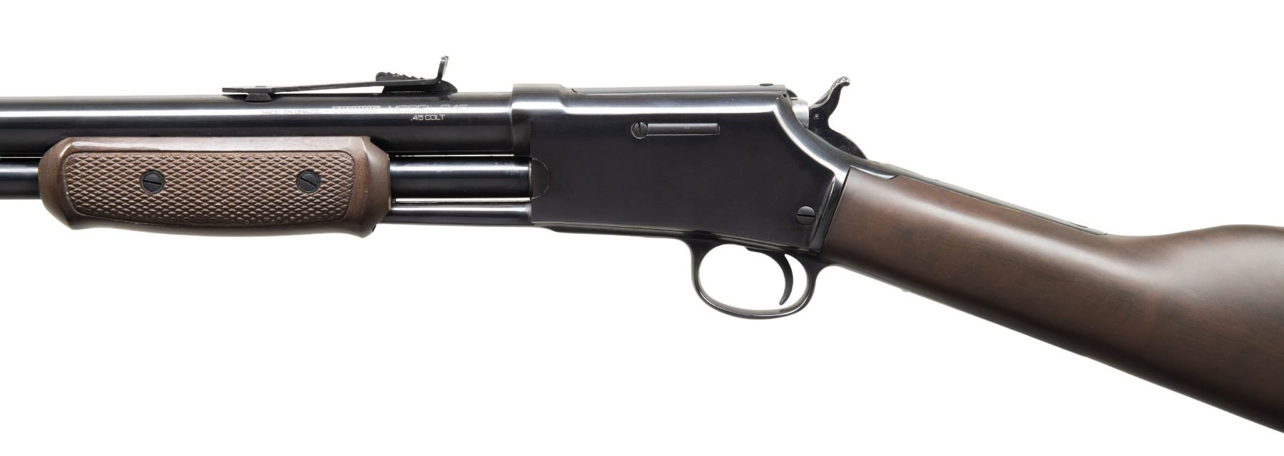 2) C45 THUNDERBOLT PUMP. Cal. 45 Colt. S# ZD4818. Mfg. 2006-2009 patterned after the Colt Lighting. Rnd. 26" barrel. Blade front sight & elevator adj. rear sight. 13 Shot tubular mag. Blued finish. Walnut stock set w/ checkering on slide forearm. CONDITION: near excellent metal & wood finish with light handling marks. PROVENANCE: From the PMRB Collection. (25-5958/MD). ALL MODERN. $600-1,000.