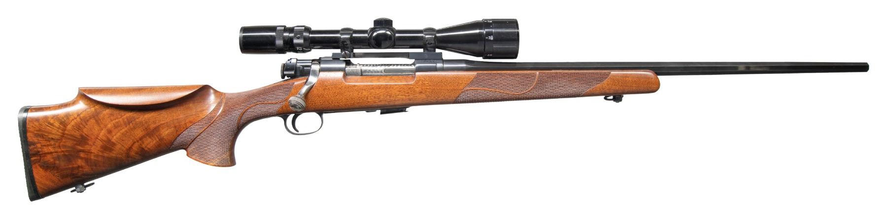 ACTION RIFLE. Cal. 22 LR. S# 11082. Bbl. 23" octagon created from its original round configuration retaining the Springfield caliber marking plus "D1816" drawing number on its bottom just forward of the receiver. Mfg. mid to late 1930's (classed as Modern due to customizing) with improvements over the original 1922; mainly the bolt having adjustable headspace plus a newly designed striker assembly for faster lock time which is conducive to accuracy. Drilled and tapped for right side receiver sight, its Redfield one piece scope base plus a Unertl style target base on the barrel at the proper 7.2" on center spacing from front set of the receiver. Superb metal finish that includes recontouring of the trigger guard bow. Bolt assembly has replacement custom handle with relief for scope use plus knurling around circumference of its pear shaped knob . Bolt is marked "C3998", fitted with Buehler low scope safety and has a jeweled body. Redfield 1" single under screw scope rings holding Japanese gloss finished Bushnell 4-12X40AO scope with duplex reticle. Beautiful, high quality checkered walnut stock with black basket weave faced Pachmayr buttpad. Multi panels of borderless checkering to include ribbons, points and wraparound forend panel. Grip is tear drop shaped and buttstock has raised cheekpiece (light roll over) with Monte Carlo profile. Nice straight grained front section of stock; very fine figure in butt area. Vintage detachable 1" sling swivels have push button release that is now popular again on modern military style rifles. Original trigger has been modified to reduce backlash. All of action and barrel channel are glass bedded. A great full sized rimfire sporting rifle. MAGS: 1 aftermarket (likely by Triple-K) 4 rd. CONDITION: All visual aspects are near excellent including bore and scope set. Safety does not function properly as it intermittently releases when manipulated while cocked; should have immediate gunsmith attention for safety. PROVENANCE: from the renowned collection of quality sporting arms from Lewis Drake together with inventory of Lewis Drake Associates. (25-6157/NW). MODERN. $750-1.000.