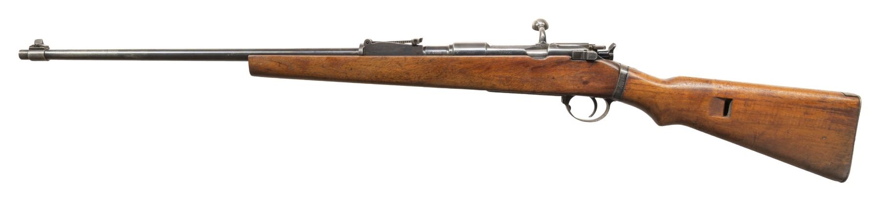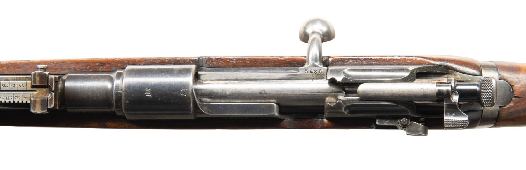 Cal. 8mm Mauser. S# 7434. Bbl. 23 1/2". Blade front sight without hood. Tangent rear sight graduated to 2000m. Bolt is a mismatched G98/40 replacement. All other visible parts are matching to receiver. Receiver ring has "jhv" code for FEG & 41 date for 1941. Blued finish. Cutdown walnut stock set with German inspection stamps on right side of butt & sling stud holes. CONDITION: stock appears lightly sanded with added finish, a chip forming behind action, scattered staining, some dings & handling marks. Metal retains 70% blue with scattered edge wear, thinning fading to gray & oxidation. Action functions properly when hand cycled. Very good bore with strong rifling. (25-6596/MJC). MODERN. $300-400.