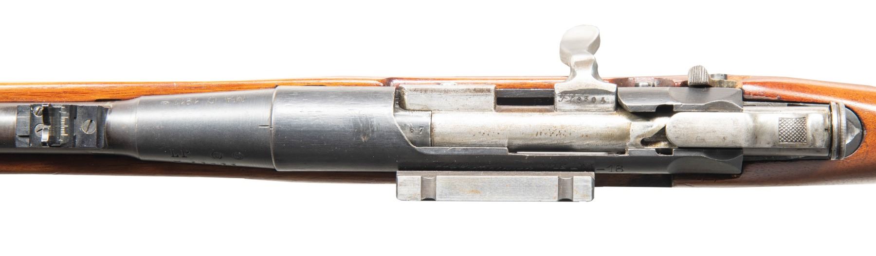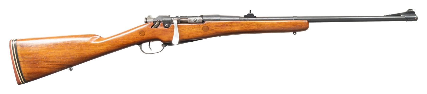 Cal. 8mm Lebel. S# E41073. Bbl. 21 1/2". Ramped Lyman gold bead front sight. Sporting style rear light. Left side of receiver has added commercial scope mount & two extra holes behind mount. Matching numbers on bbl. & floorplate. Three-shot mag. Bolt parts are mismatched with altered spoon style handle. Right side of action has aftermarket added manual safety. Bbl. has 1917 date with MAC arsenal markings & without N balle marking. Blued finish. Cutdown hardwood stock set with a few plugged areas, bottom mounted sling studs & White Line recoil pad. LOP: 13 5/8". CONDITION: sanded stock set has added finish with a hairline crack behind upper tang, some dings & handling marks. Magazine body is proud of wood & front action screw shows some notable slot damage. Metal retains 90% arsenal rework blue with some oxidation, edge wear, handling marks & fading. Action functions properly when hand cycled. Bright near excellent bore. (25-6585/MJC). MODERN. $75-150.