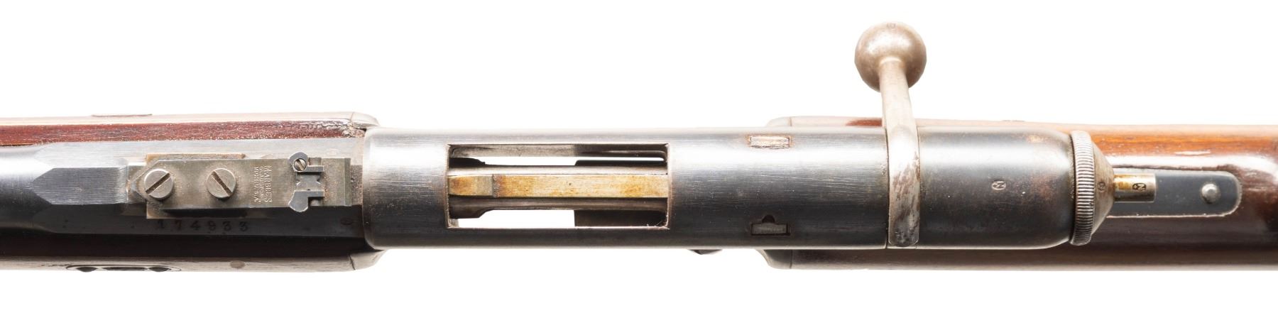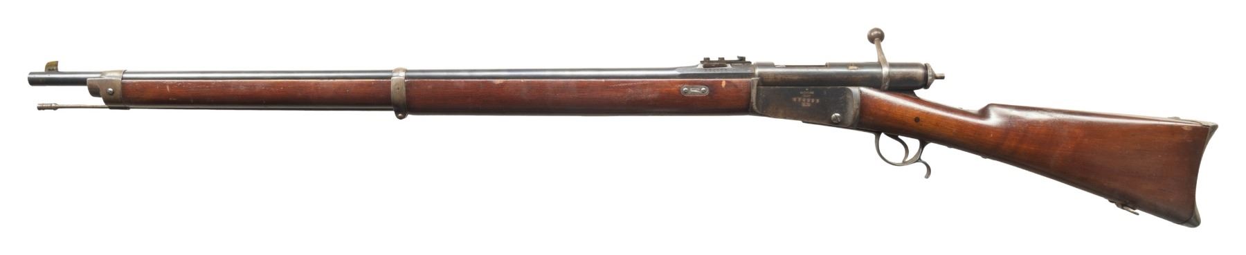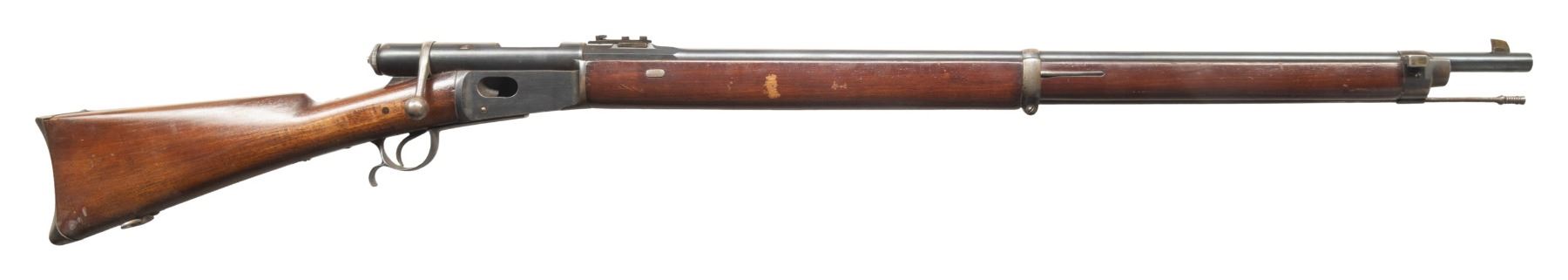 1) Bern M78 Percussion Conversion Rifle. Cal. 45. S# 1 74933. Bbl. 33". Brass blade front sight. Marbles rear sight. Swiss Vetterli converted to percussion muzzle loader with nipple in chamber. Blued finish. Walnut stock set with bottom mounted sling swivels. Ramrod present. CONDITION: stock has added finish with a 2 1/2" crack on rear of forend, scattered handling marks, dings & finish wear. Metal retains 80% blue with scattered oxidation, edge wear, handling marks & fading. Action functions properly when hand cycled. Very good bore with strong rifling. (01-28406/MJC).