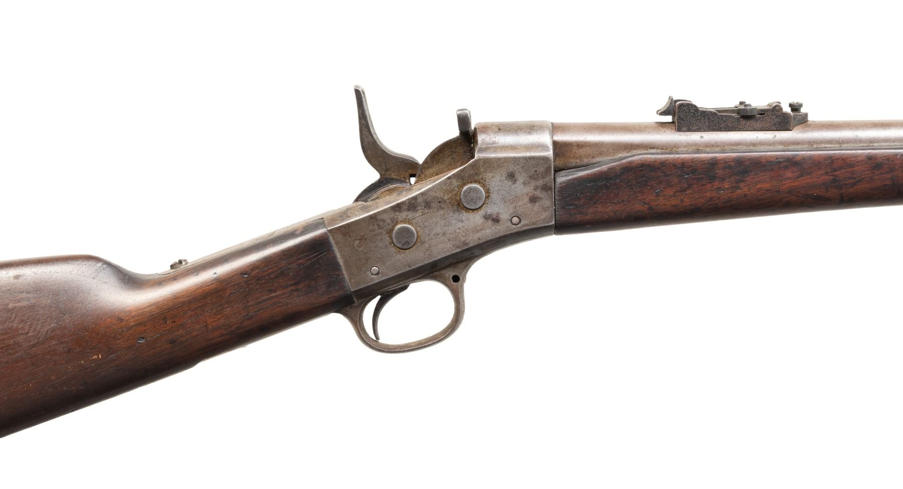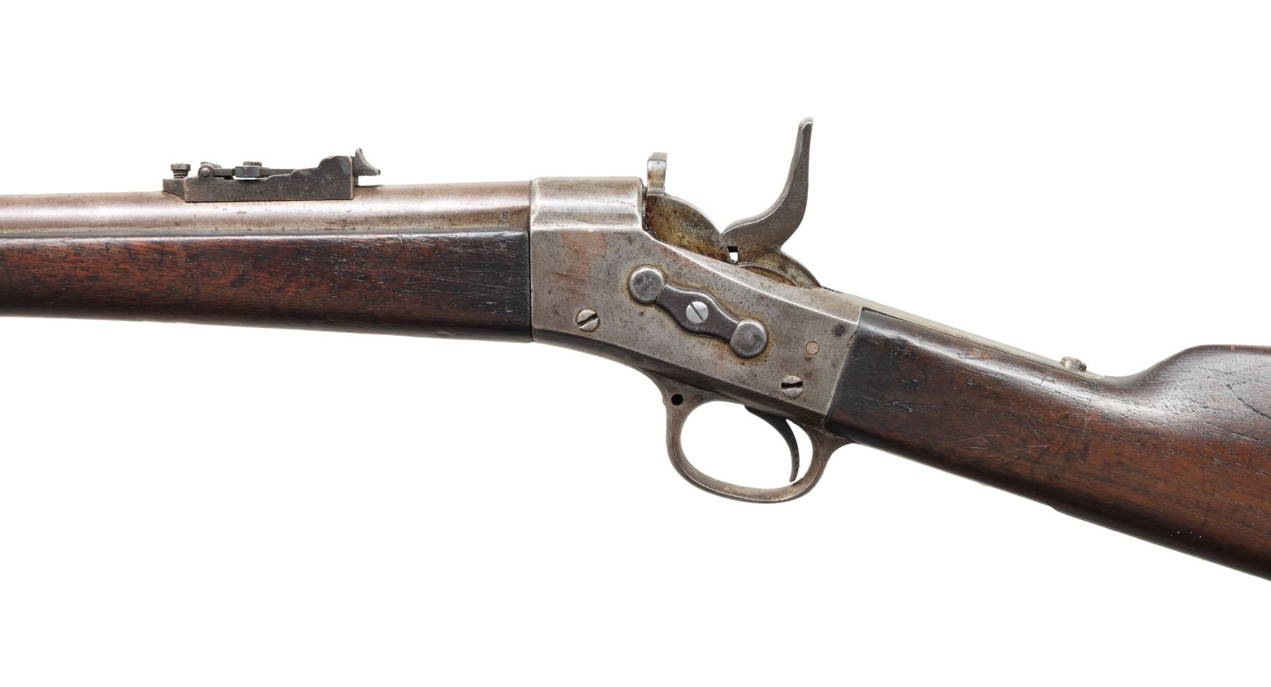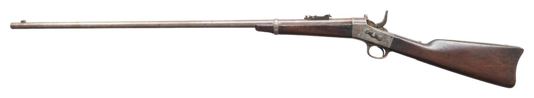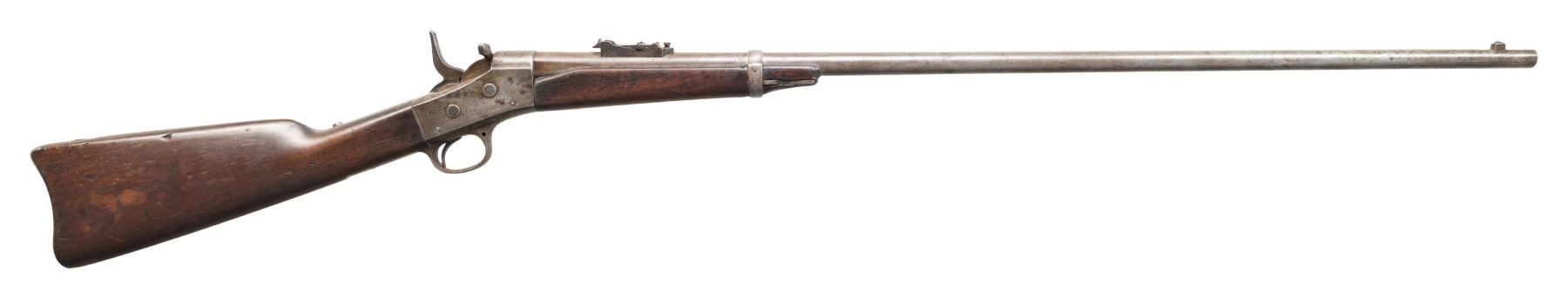 RIFLE. Cal 50 CF (Likely 50-70). NSN. Bbl. 36". Blade front sight. Ladder rear sight. Rifle appears to be a cutdown military Rolling Block rifle. Walnut stock set with cutdown forend. CONDITION: refinished stock shows a notable chip at right rear of forend, some further chipping, scattered dings, finish loss & handling marks. Metal is a dull gray patina with some dings, oxidation & handling marks. Acton functions properly when hand cycled. Bore is mostly bright with scattered oxidation & pitting patches but good rifling. PROVENANCE: Estate of Groves Herrick. (01-28324/MJC). ANTIQUE. $200-400.